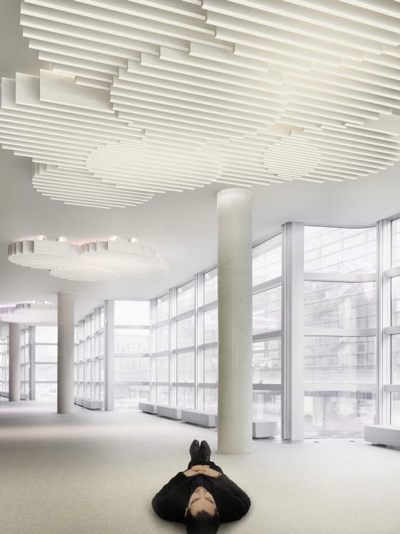 "What sets the Corpus modules apart is that they can be freely placed and combined," explains Hansen. "They can be hung very simply between the pipes. It isn't a finished system – we leave the actual ceiling design to the architect." And OWA has been thrilled with how architects have taken to the idea. Unlike more familiar ceiling sails, the Corpus modules are voluminous cuboids, 15 or 30 centimetres in height depending on the model. Their form yields a greater sound-absorption area while at the same time lending them a stronger spatial presence. "Architects can use them as a visual counterpoint to the height of the space," says Hansen. Incidentally, Corpus is especially effective not just in new buildings, but in conversions as well.