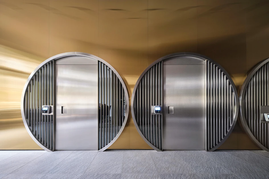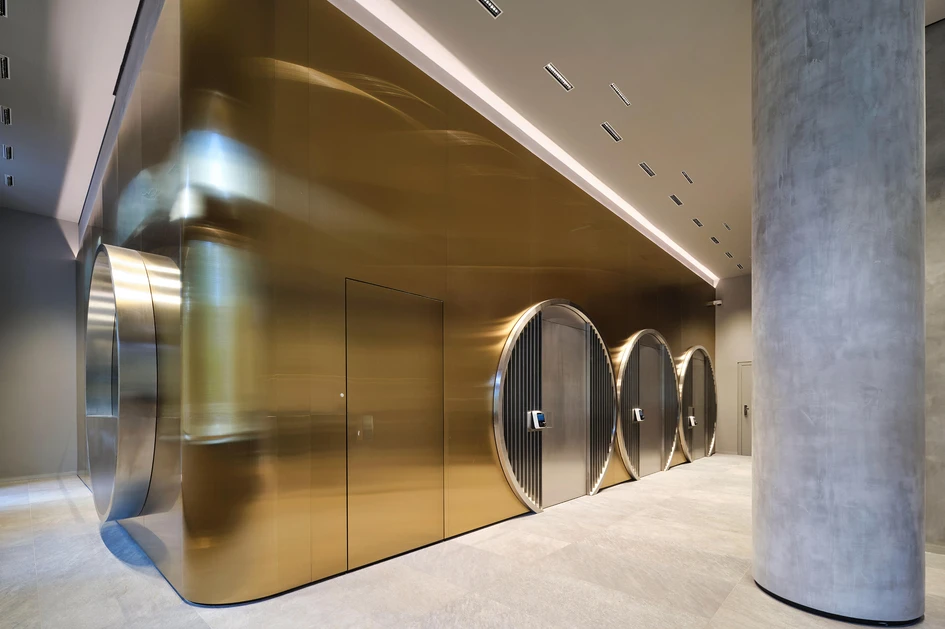 With more of our money, and indeed entire currencies, solely existing in digital format, the need for banks to house large and imposingly high-security vaults is being reduced. But many bank customers still have other physical items that need protection. In steps the role of the safety-deposit box. While the Hadi Teherani-designed safety-deposit box provider Trisor uses an advanced digital security system to keep its customers’ valuables secure – instead of the traditional mechanical locking vault with oversized circular door, the space’s three vaults still feature highly evocative arched vault ‘doors’, presenting a trusted image that technology alone can not. The branch’s product and material palette of luxury furniture and lighting alongside gold-hued surfaces, meanwhile, give the secure space Federal Reserve vibes.© Architonic