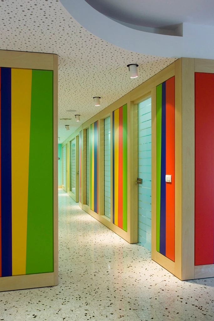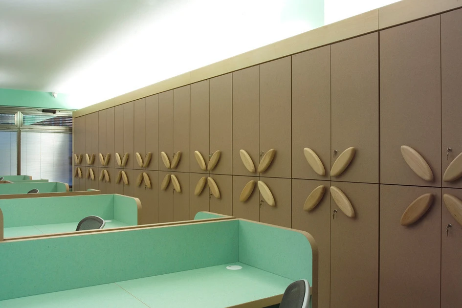 Wooden pillars and walls in strips of bold primary colours flank an elongated corridor, surrounding loan management and administrative offices, while storage cabinets on the other side of the branch feature tongue-in-cheek symbolism, with stylised four-point vault wheel spokes forming the handles. ‘In this way, areas that in banks have been traditionally staid and bleak,’ explain Massimo Mariani, ‘have been reinvented to give them an amusing and more optimistic look.’