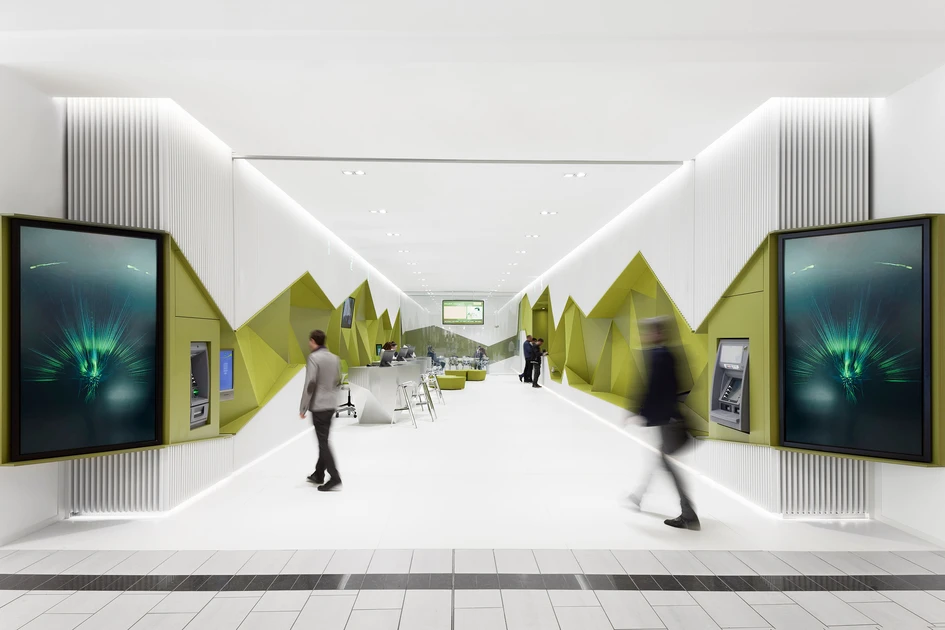 DSK Bank, meanwhile, brings new meaning to retail banking by locating its Flagship Branch in a shopping mall in Sofia, Bulgaria, and designing the interior like a high-end retail space. A wide, calm central area provides plenty of space for customers to enter and feel at ease, before taking to informational devices in self-service areas, or waiting for an open consultants’ desk for human help and consultation.