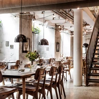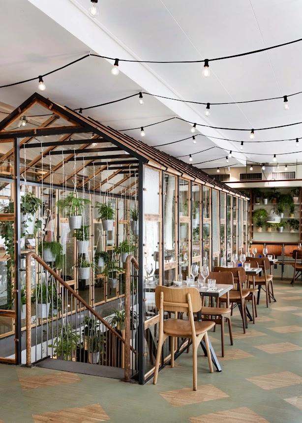 Located in the middle of Copenhagen’s old Latin quarter, Vækst is part of the city's innovative food collective Cofoco. Designed with Danish recycled materials expert Genbyg, the restaurant's decor is centered around an extravagant, two-storey greenhouse made from repurposed windows that also hides the space's central staircase. Recycled wood abounds in the rest of the space, too, as well as hanging plants and overhead string lights that lend an air of romanticism to the industrial ceilings on both floors.