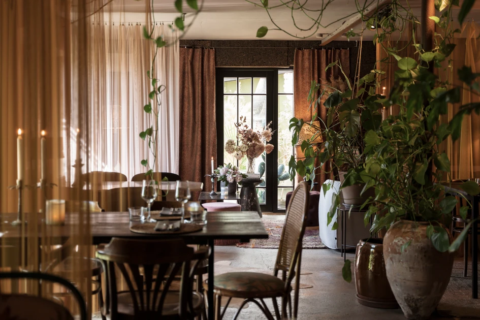 The restaurant in particular bursts with playful patterns and textures. Cork lines the walls for insulation and moisture regulation, while whimsical room-divider curtains, dried plants and mix-and-match rugs on polished concrete flooring give the space a lived-in feel that belies chef Jouke Knijff's elevated, local fare. Natural fibres and wood accents are scattered throughout tableware and furniture for a maximalist space that alerts the senses even before the plates start piling up.