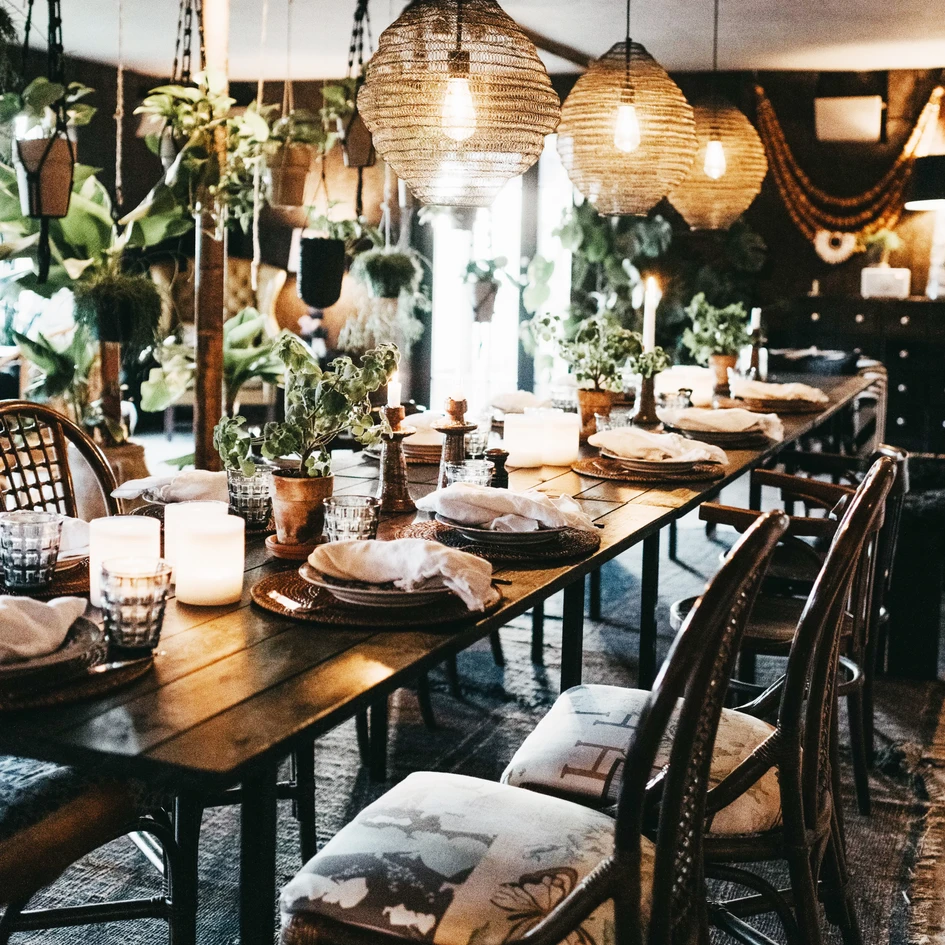 Natural fibres and wood accents are scattered throughout tableware and furniture for a maximalist space that alerts the senses even before the plates start piling up