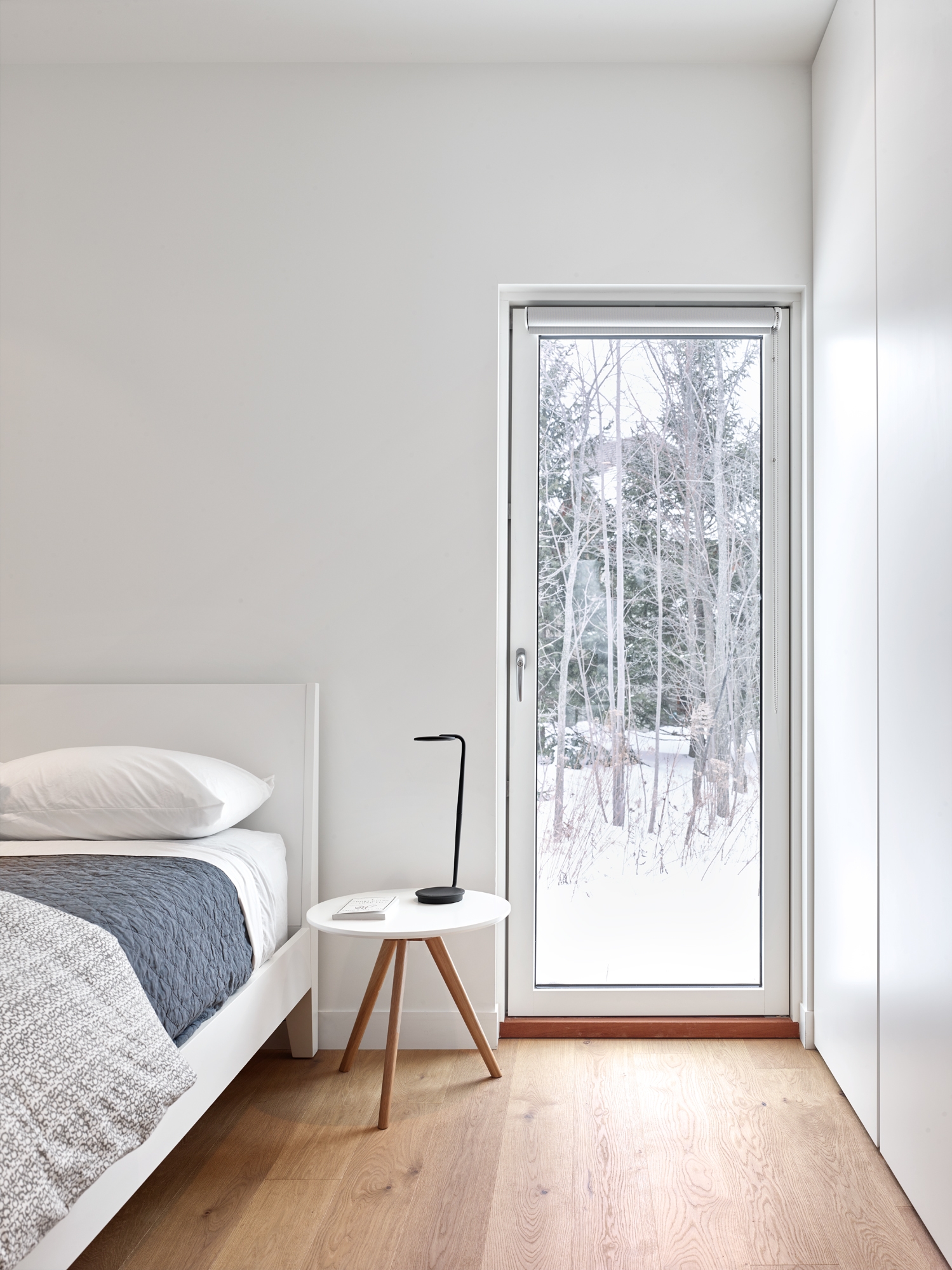 On the interior, the spare qualities of the exterior are reflected through an understated but refined material palette: every aspect is meticulously detailed. Walls and sloped ceiling planes form a sculptural composition in matte white that amplifies winter light and the purity of the snow outside, enhancing the expression of light and shadow throughout the course of the day. Wide-plank oak floors and rift-cut white oak millwork convey warmth and tactility. The drama of the blackened steel fireplace surround establishes a focal point in the main living area, its threshold demarcated by a pleasingly textured flamed basalt hearth.