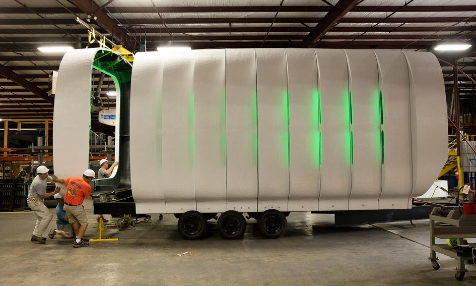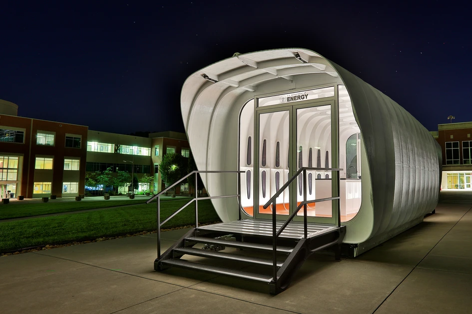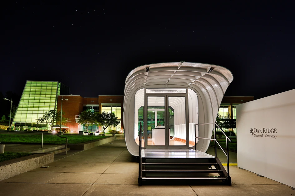 The Additive Manufacturing Integrated Energy (AMIE) demonstration project is a research and design collaboration of SOM and the U.S. Department of Energy’s (DOE) Oak Ridge National Laboratory (ORNL). Highly energy efficient, the 3D-printed building was designed by SOM to produce and store renewable power and to share energy wirelessly with a 3D-printed vehicle, which was developed by the DOE.