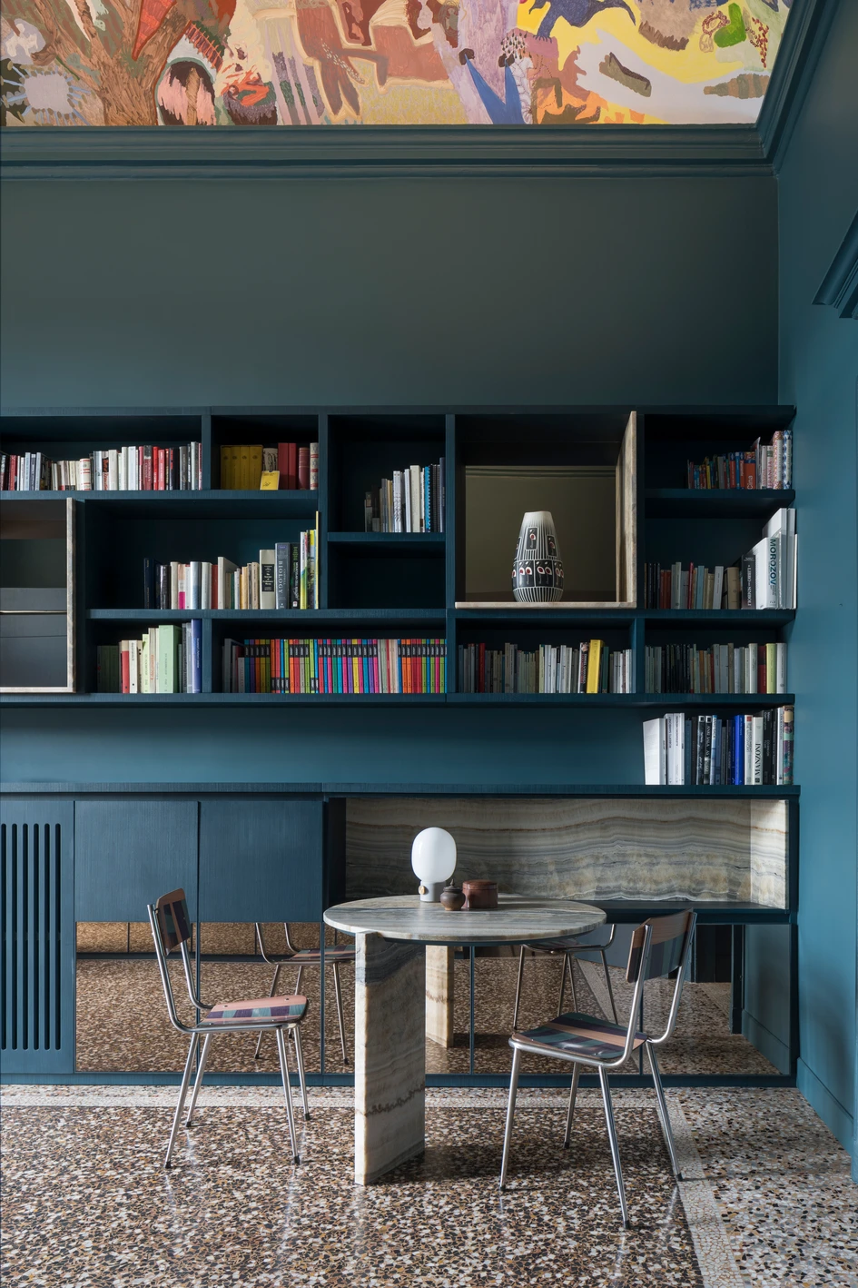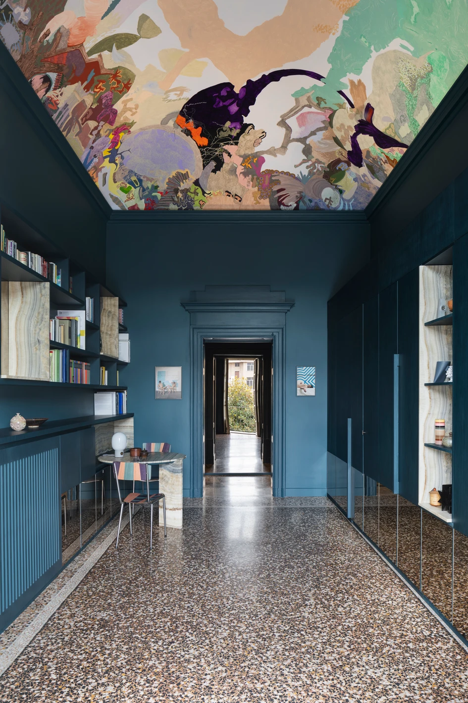 The entrance, in which the octanium colour of the walls enhances by contrast the brilliant abstract polychrome fresco by the artist Victoria Stoian, leads to the daytime rooms of the large living and dining areas, both covered by large vaults painted with decorations that have undergone careful restoration.