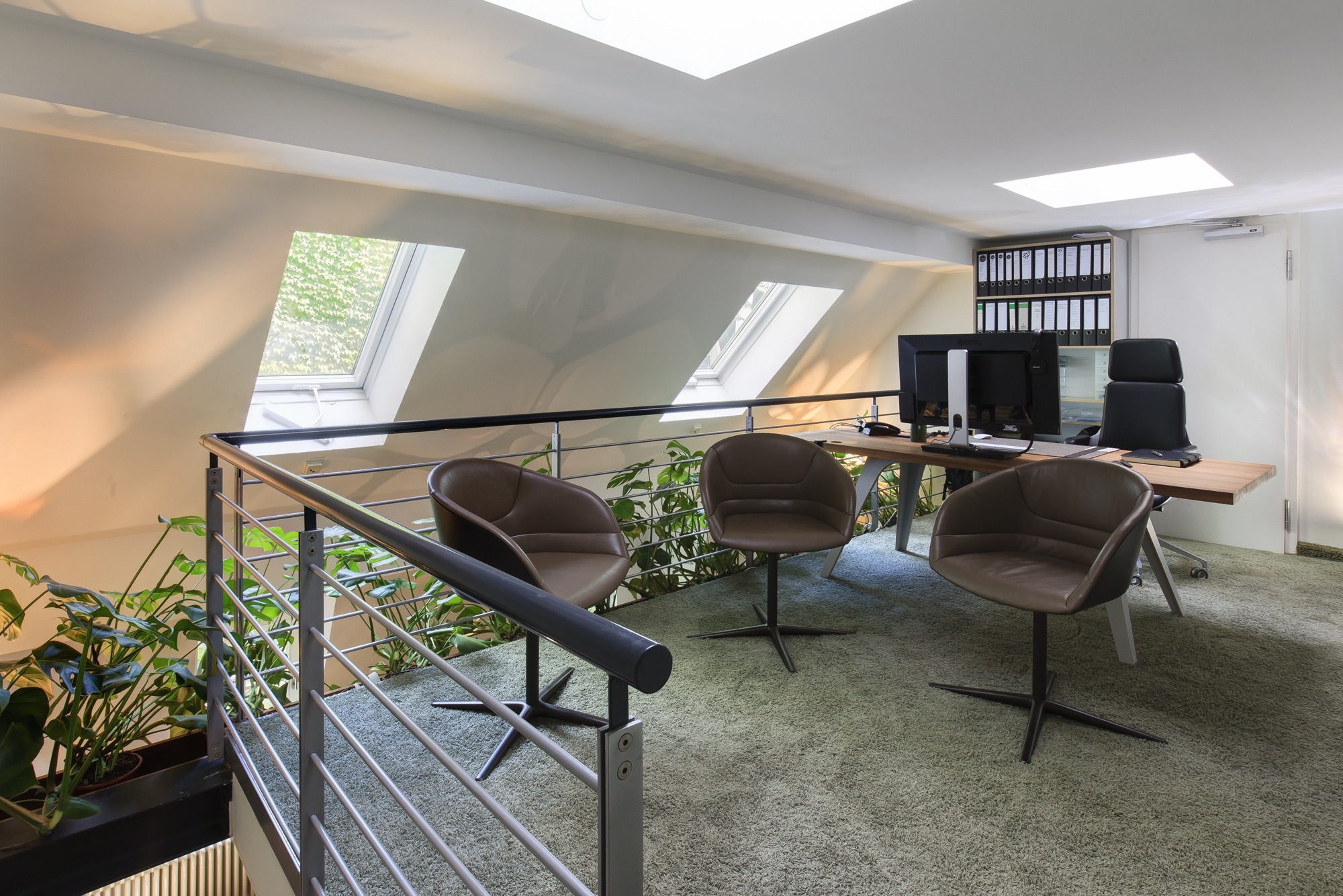 Located on the upper floor of a typical Berlin backyard Remise building, four large workstations spread over a one-room loft floor plus ensuite mezzanine. Customized office furniture, gray-green deep-pile carpeting, natural wood finishes and lush plant installations can be found on both, the main floor and the mezzanine level. In addition to natural light sources, pendant lamps highlight each workstation. Ceiling luminaires and wall fixtures permeate the room with organic light scenarios that break on half-mirrored wall panels and disperse throughout the space.