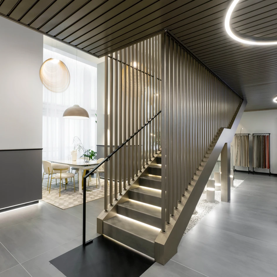 The existing iron staircase has been preserved and fitted with cantilevered stoneware steps with LED strips to accentuate the pathway, while for the balustrade it was decided to use champagne-coloured metal slats to create a vertical rhythm that echoes the load-bearing columns of the architecture and the laminates selected for the false ceiling in the area of the materioteca: a work of real craftsmanship with a great aesthetic impact, providing a dynamic effect of lightness and permeability.