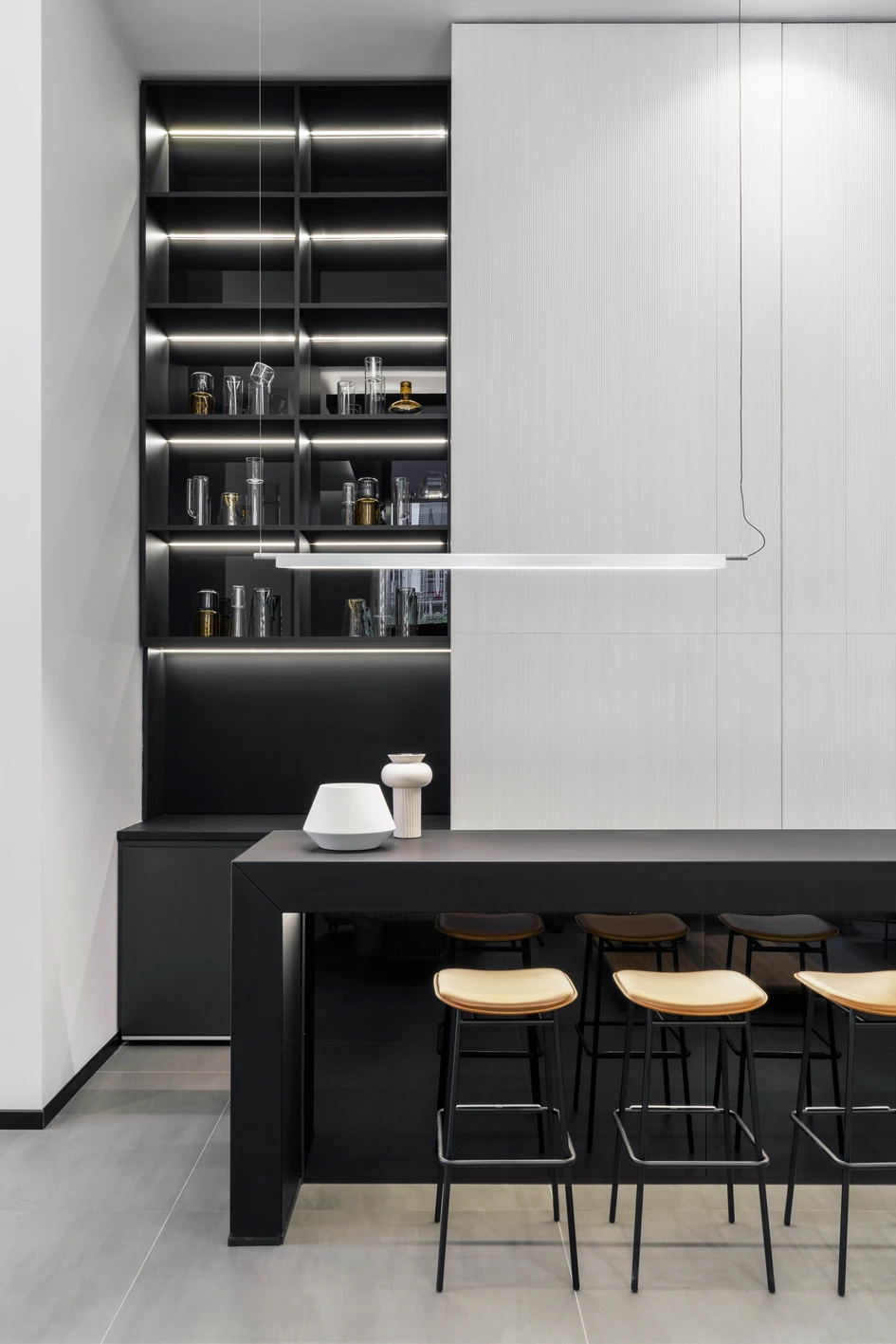 The fixed furnishings, such as the bar counter and the arched bookcase in black lacquer with reflective glass, and the portals, also in black lacquer, that mark out the pathways, were custom designed, with LEDs to emphasise their geometries.