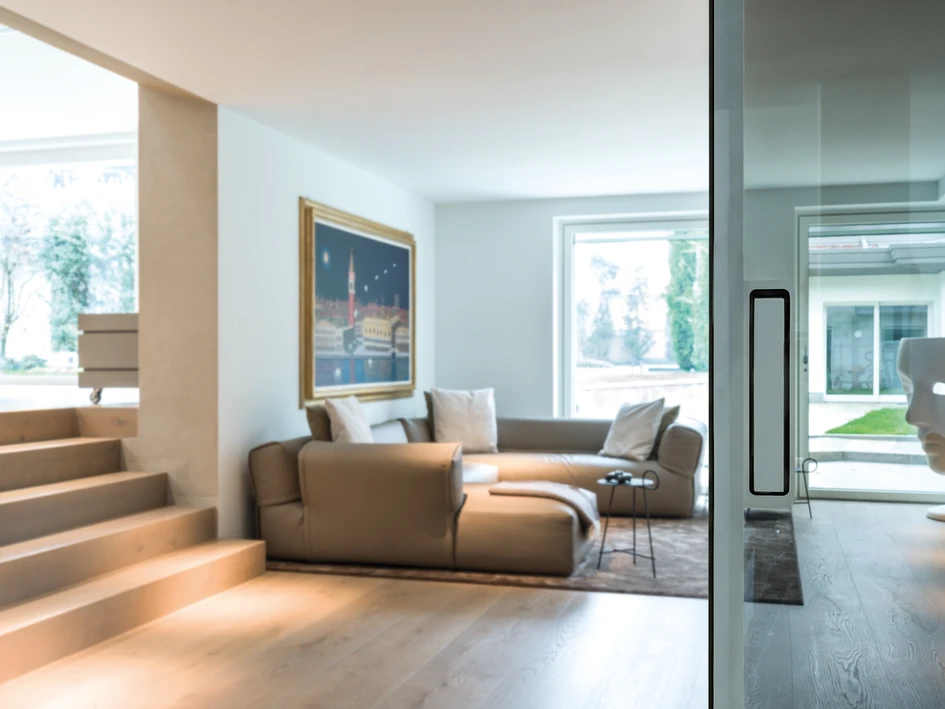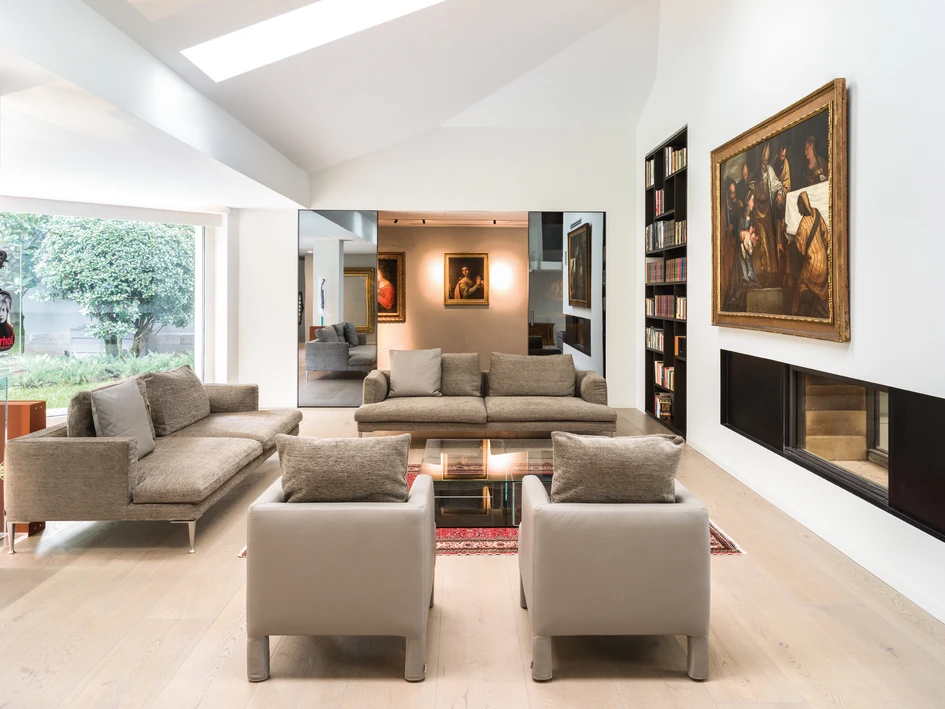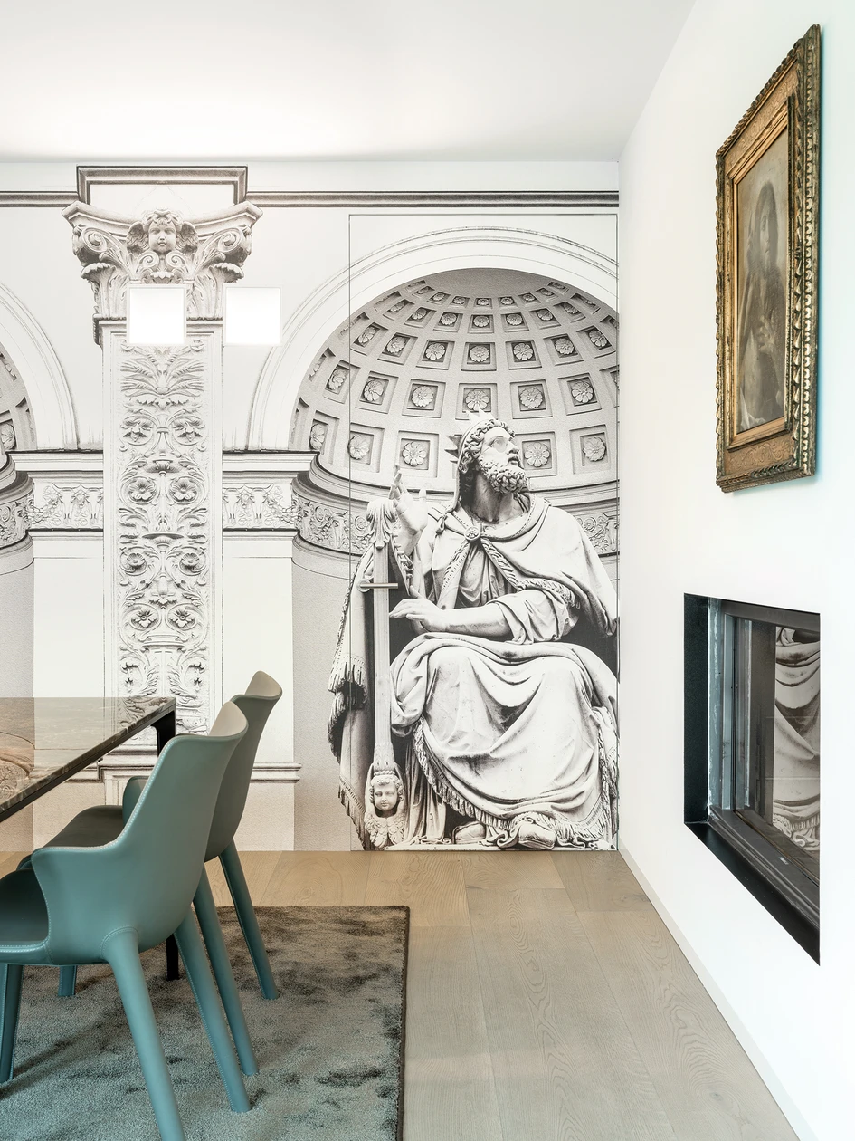 Le concept du projet de décoration intérieure était la combinaison sophistiquée du goût classique des propriétaires, en matière de matériaux et de couleurs, avec des solutions modernes, tels que des meubles et de véritables œuvres d'art. Les solutions ECLISSE ont contribué à ce résultat. Toutes les portes intérieures en bois, qu'elles soient coulissantes ou à charnières, ont la même finition que le mur sur lequel elles s'ouvrent et apparaissent minimalistes et élégantes. Dans la salle à manger, le rendu contemporain, grâce au papier peint sur mesure, combine l'art néoclassique avec une touche d'ironie moderne et insolente. Une juxtaposition audacieuse que l'on retrouve dans toute la maison, dans l'ameublement et les finitions. Par exemple le parquet récupéré de Cortina d'Ampezzo ou la collection privée de tableaux de la Renaissance côtoient et contrastent avec les créations modernes de l'artiste Dondè.