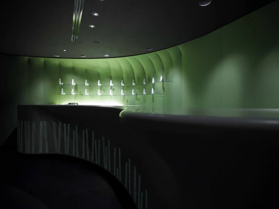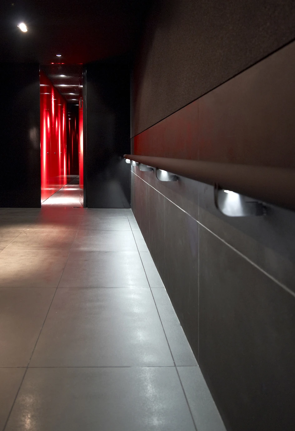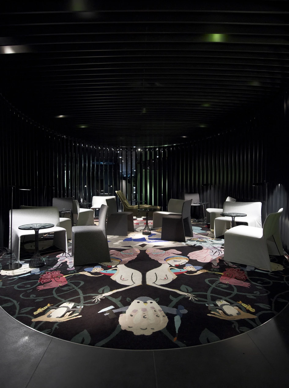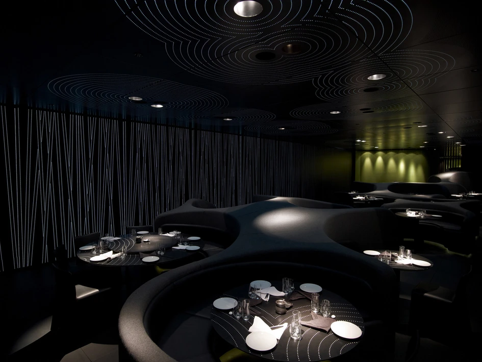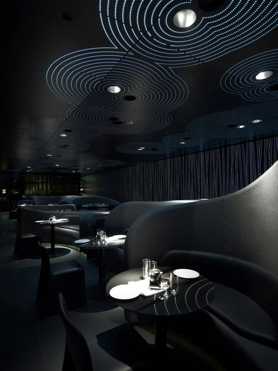 The restaurant’s interior is conceived as a dynamic masculine space, with its furniture tactile and feminine. The seating is arranged in a central sculptural element which floats within the charcoal anodized box. Intricately crafted and luxurious semi-private seating makes Chan cosy and intimate. The seating booths cater for two or for larger groups. There lies a dramatic sense of layering within the space from the graphically lit wall panels, open grid ceilings, to the engraved detailing on the tables. Tattooed graphics on upholstery and 21st century ‘manga’ interpretations within the cocktail lounge; this becomes an experience of Asian street culture and cosmopolitan sophistication.