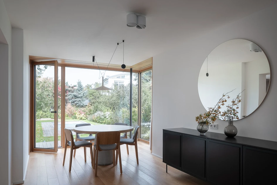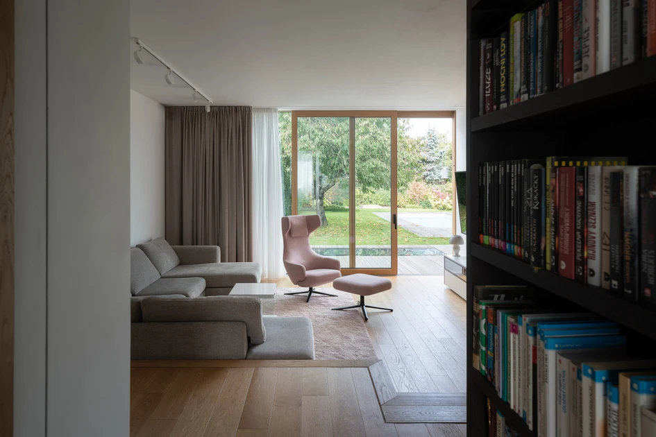 On the first floor, the individual rooms surround the central staircase creating an interconnected space. The visual connections and the views to the garden became an important element of the design. A large sliding door connects the living room with the garden. Clearance and height change of the floor helped the direct connection to the terrain level of the garden. Due to the increased height of the room, the entire floor became more dynamic.