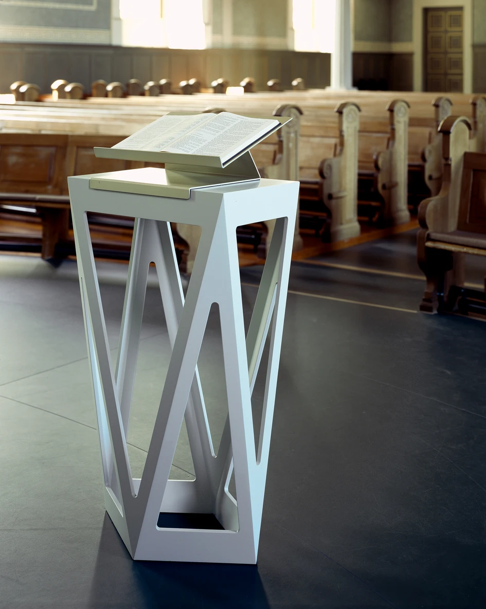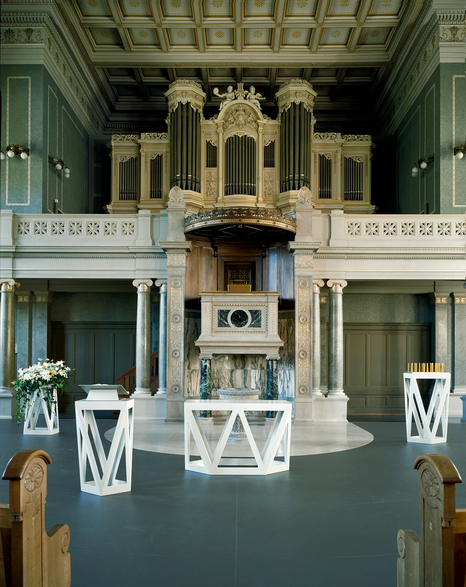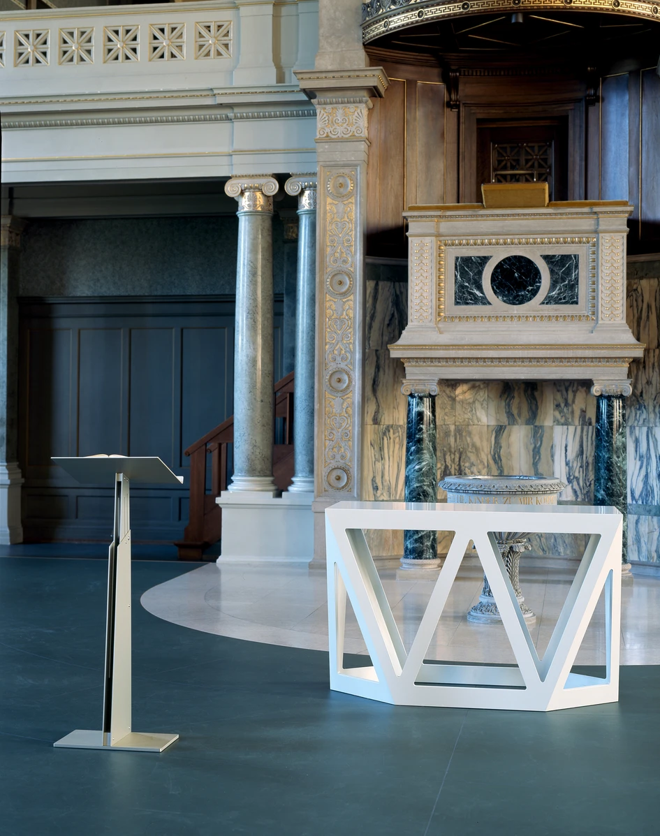 The reformed Neumünster church’s redesigned choir area creates a flexible space for different types of service. Frédéric Dedelley was responsible for developing the liturgical furniture and other objects, which dovetail with their spatial context – in terms of both colour and form. The five-module concept is based on a crystalline formal language, which takes a thematic cue from the surrounding architecture. Similarly, colours and materials make reference to the church’s interior.