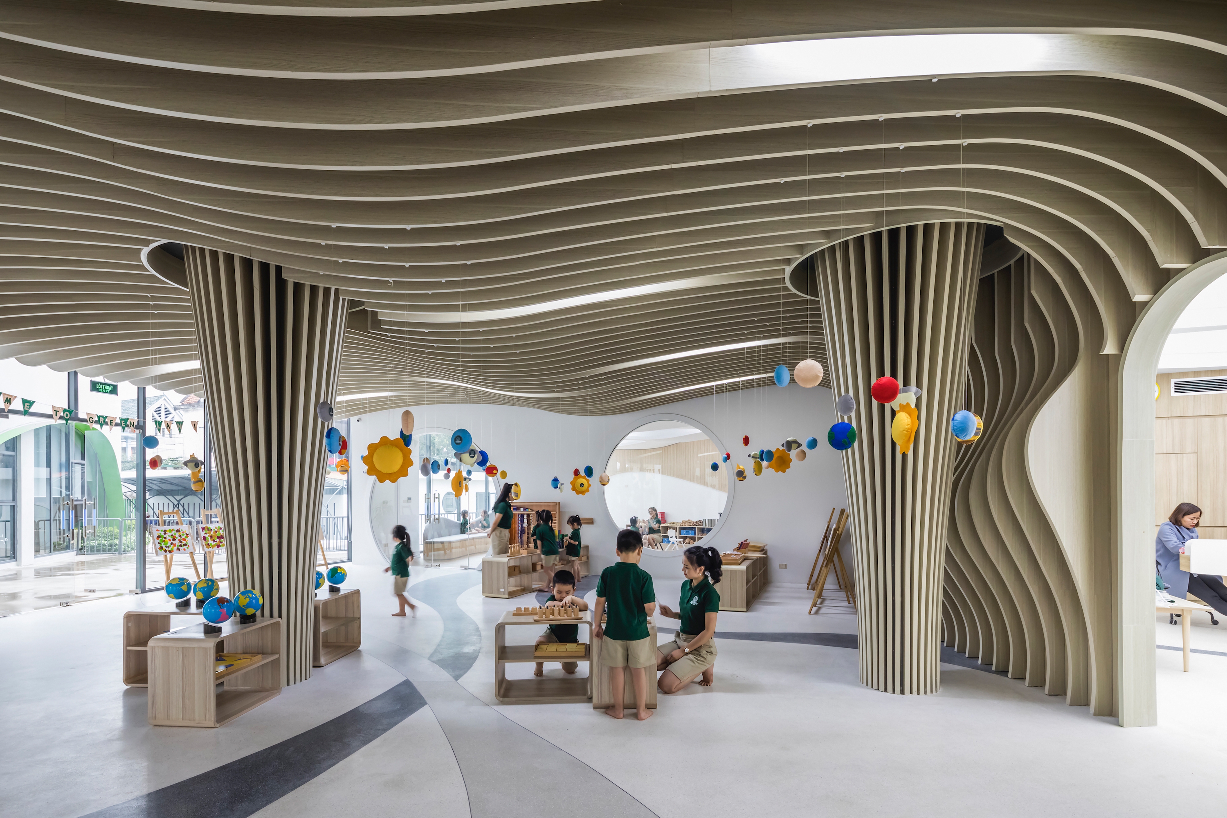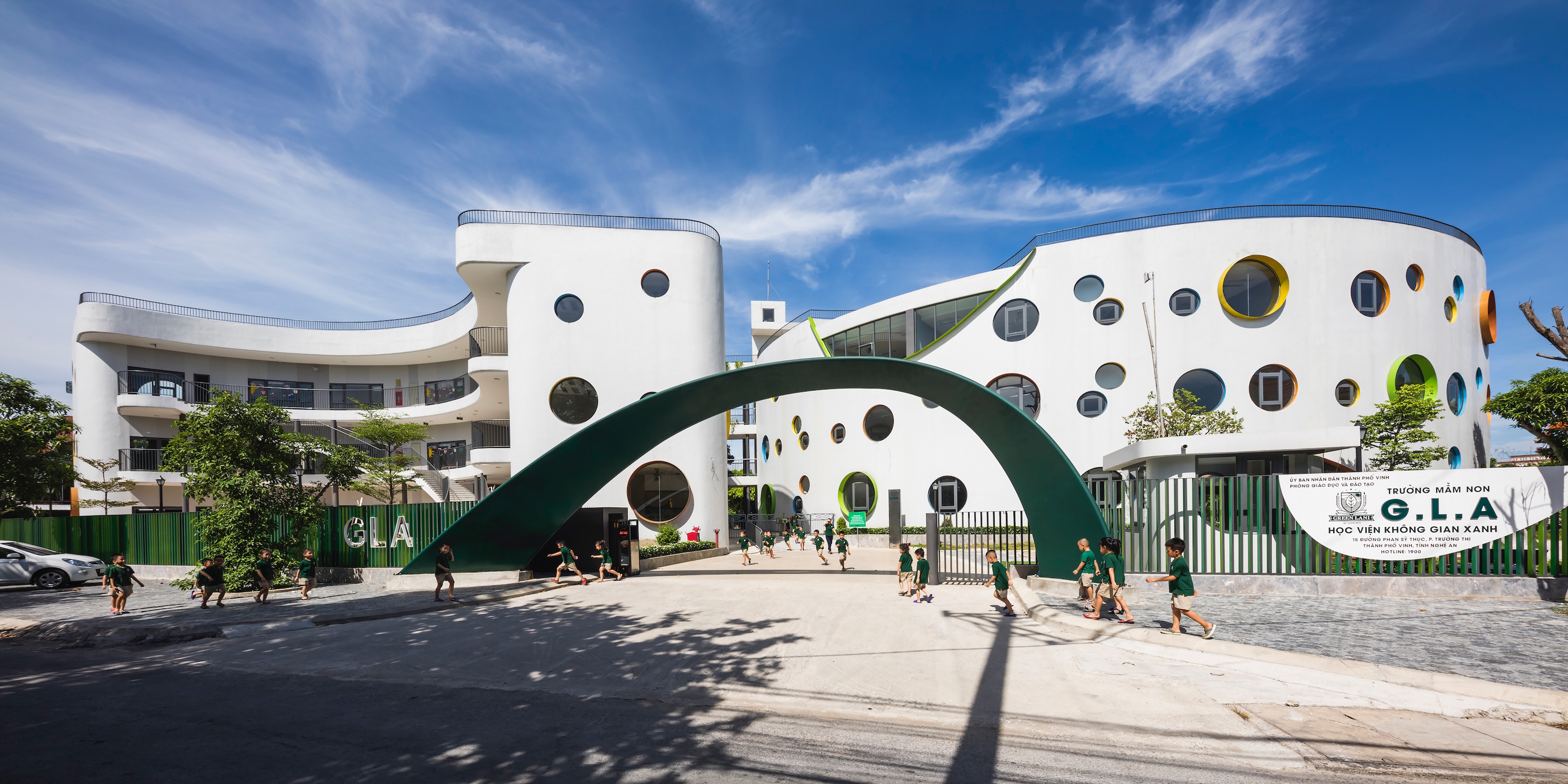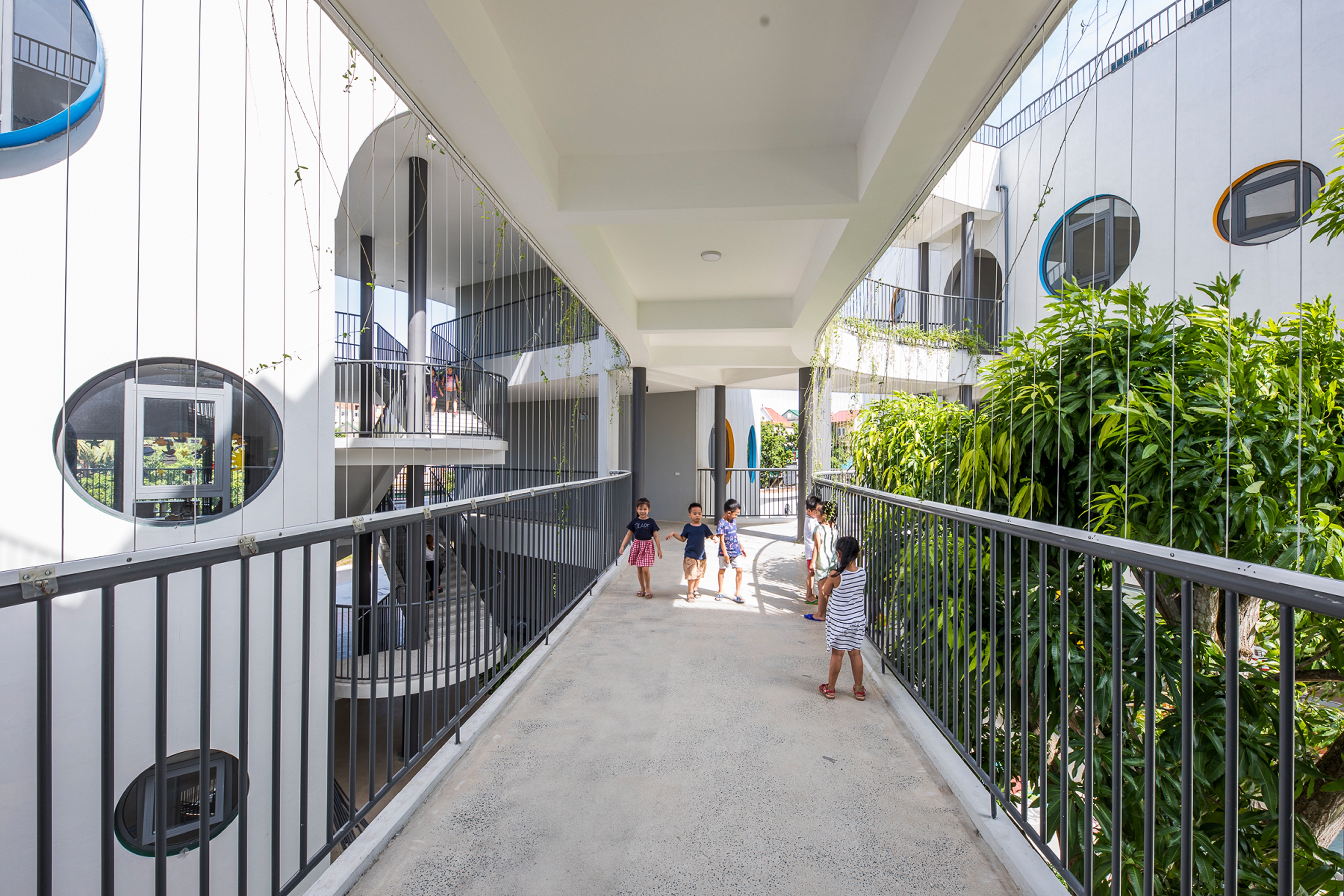 The kindergarten in Vinh, near Hanoi, Vietnam, unfolds with three semicircular buildings over three levels linked by bridges generating a series of interconnected indoor and outdoor spaces that are playful and safe while making an architectural statement.
