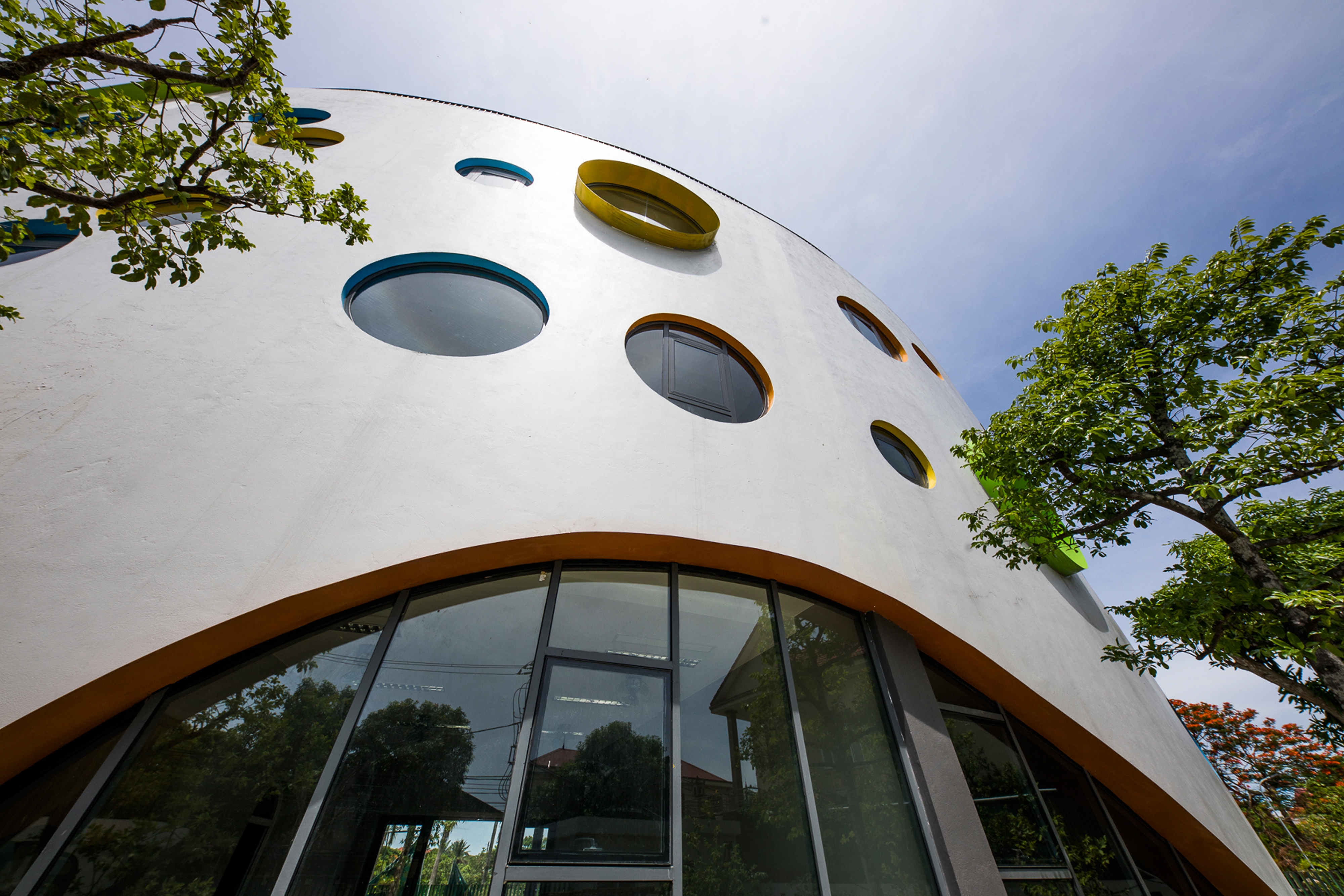 They feature multiple circular cut out windows framed in bold primary colours and organic-shaped windows on the ground floor, all of which vary in height and size so they reflect the needs of different age groups. The strong window frame colours on a white background make attractive venues for children. They give glimpses of the lake and city in the distance and provide light and cross ventilation.