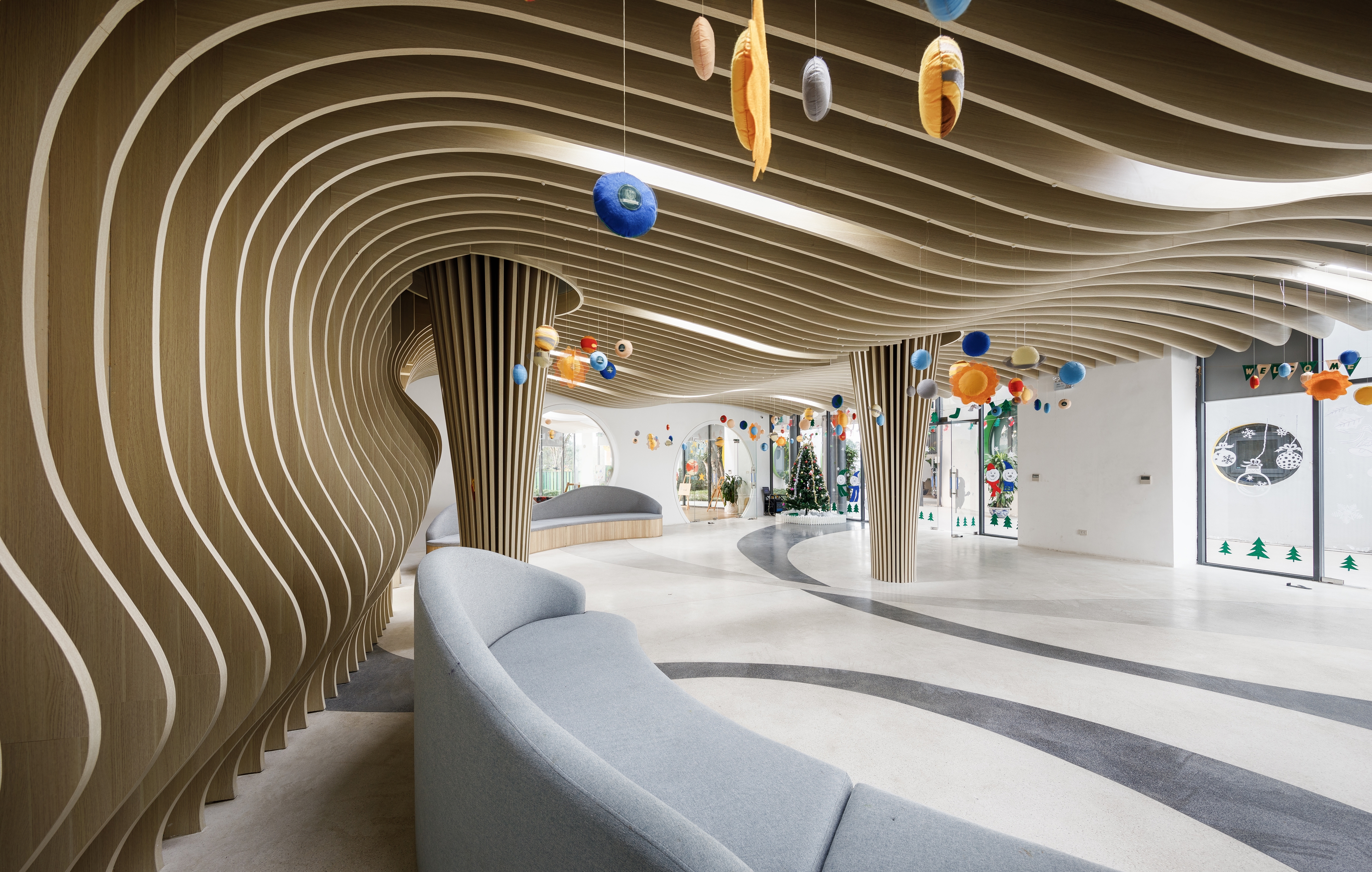 Physical development is also nurtured through these indoor and outdoor playgrounds, a sports centre and a swimming pool promoting a healthy lifestyle. And creativity too - with art classes, music room, library and masterchef kitchen. Ceilings feature fun flowing shapes and dinosaur-like ribbed surfaces.