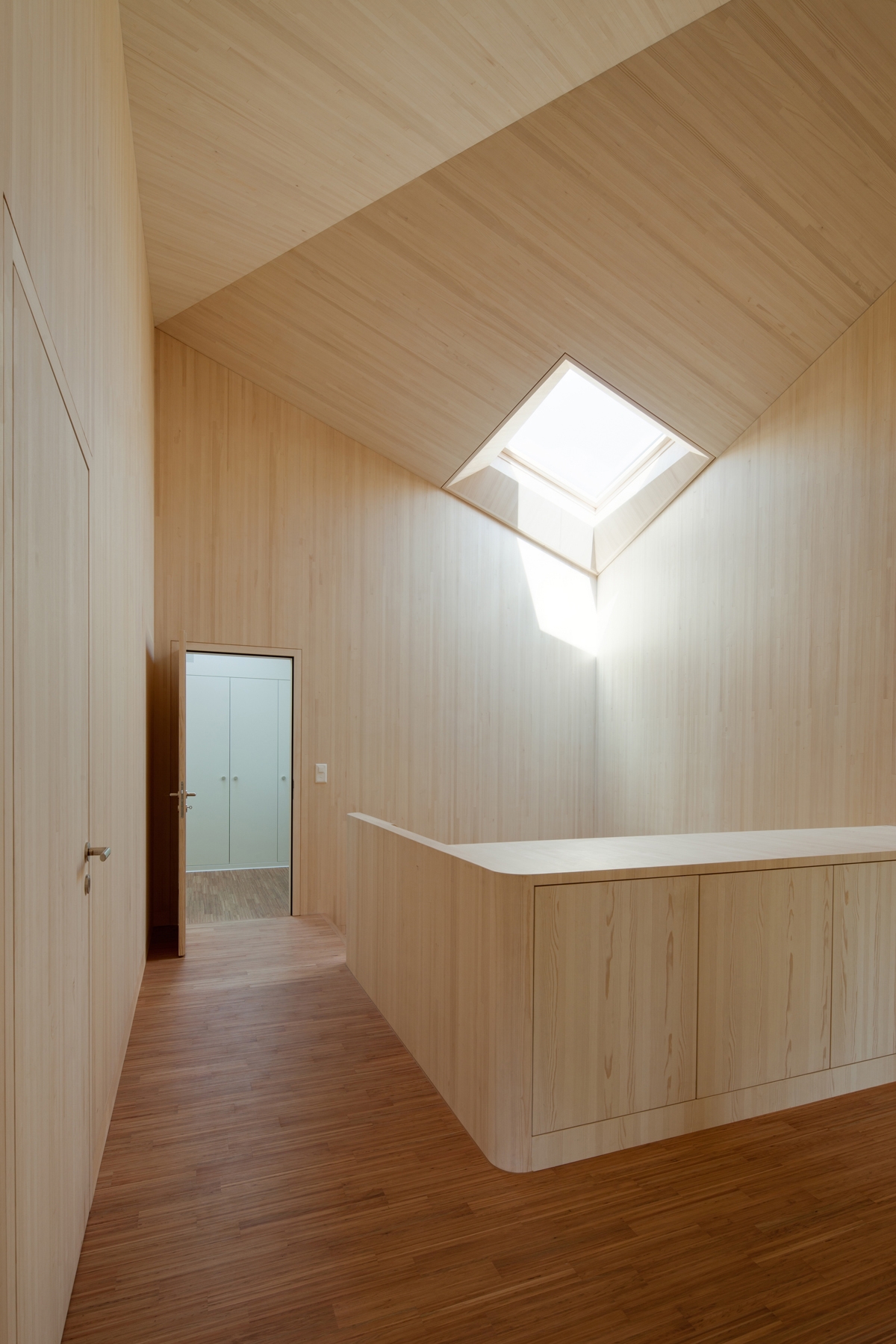 Die Nutzung und Ausrichtung der Räume findet auch in der Gebäudevolumetrie ihren Ausdruck. Die Trauflinie verläuft schräg und formuliert die Gebäudehöhe entsprechend der Position und Bedeutung der Räume; beim Hauseingang ist die Gebäudehöhe am niedrigsten - so wirkt der Eingang über die geringe Höhe eingeschossig, als geschützter Bereich, angepasst an den Massstab des eintretenden Menschen, und steigt an nach Süden, dort wo der maximale Bezug zum Aussenraum gewünscht ist und sich die Aussicht zum Höhepunkt entwickelt. Diese Szenografie der Fassadenverlaufes rund ums Gebäude lässt eine Dachform entstehen, die sich mit ihren Schrägen gut in die Landschaft einfügt.