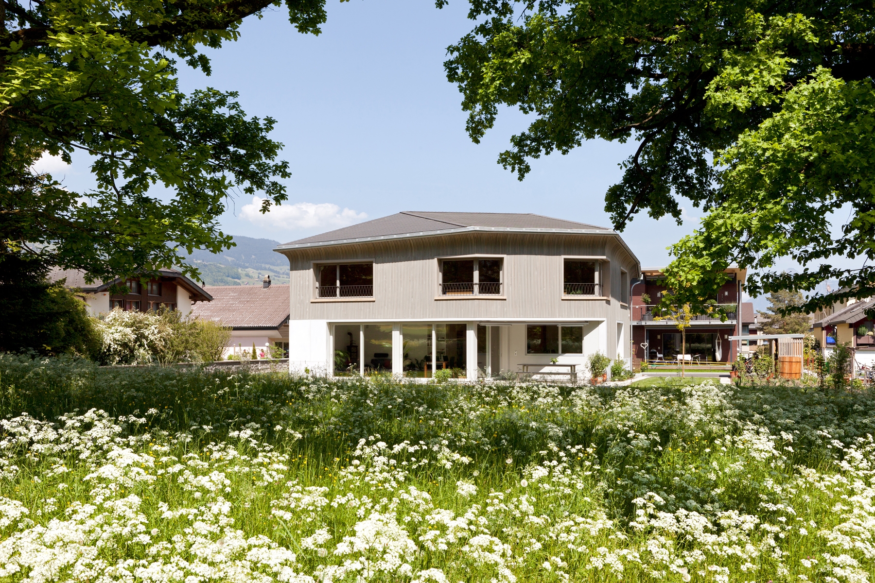 Die Aufteilung von Wohnen im Erdgeschoss und Schlafen im Obergeschoss findet ihre funktionale Entsprechug im Fassadenausdruck. Die Materialisierung verbindet Bilder des traditionellen Bauernhauses mit einer zeitgenössischen Interpretation. Die äussere Erscheinung nimmt die klassische Gliederung auf: Der Sockel wirkt massiv, das Obergeschoss und die Dachuntersicht mit Holz verkleidet. Das eternitschindelverkleidete Schrägdach ist eine Referenz an das ehemalige Eindeckungsmaterial mit Steinplatten. Die Materialisierung der Fassade ist ein Zusammenklang von erdigen natürlichen Tönen im hellen Grau- und Braunbereich. Stahltonelemente in übergrossen Elementenlängen bilden einen sehr guten konstrukiven Schutz im Sockelbereich. Die Holzlattung wird vertikal montiert, alternierend vor- und rückspringend. Diese Wellenform generiert ein feingliedriges und vielseitiges Licht- und Schattenspiel mit ornamentaler Wirkung.
