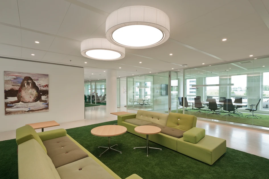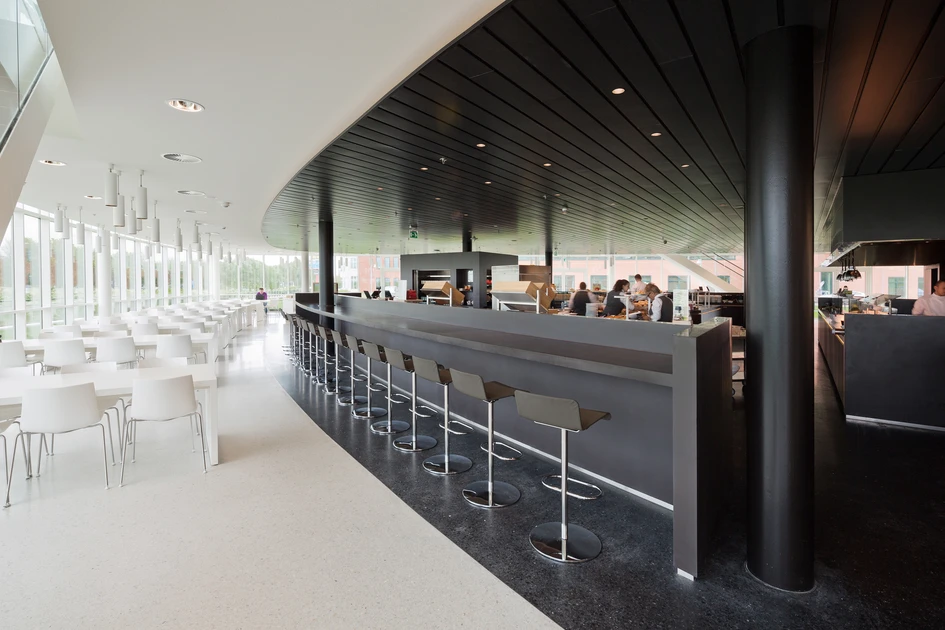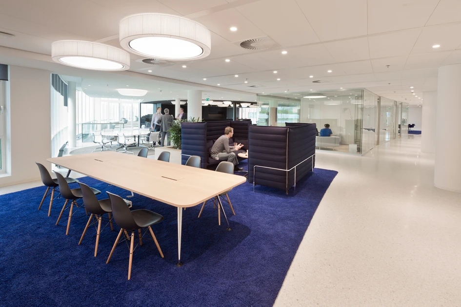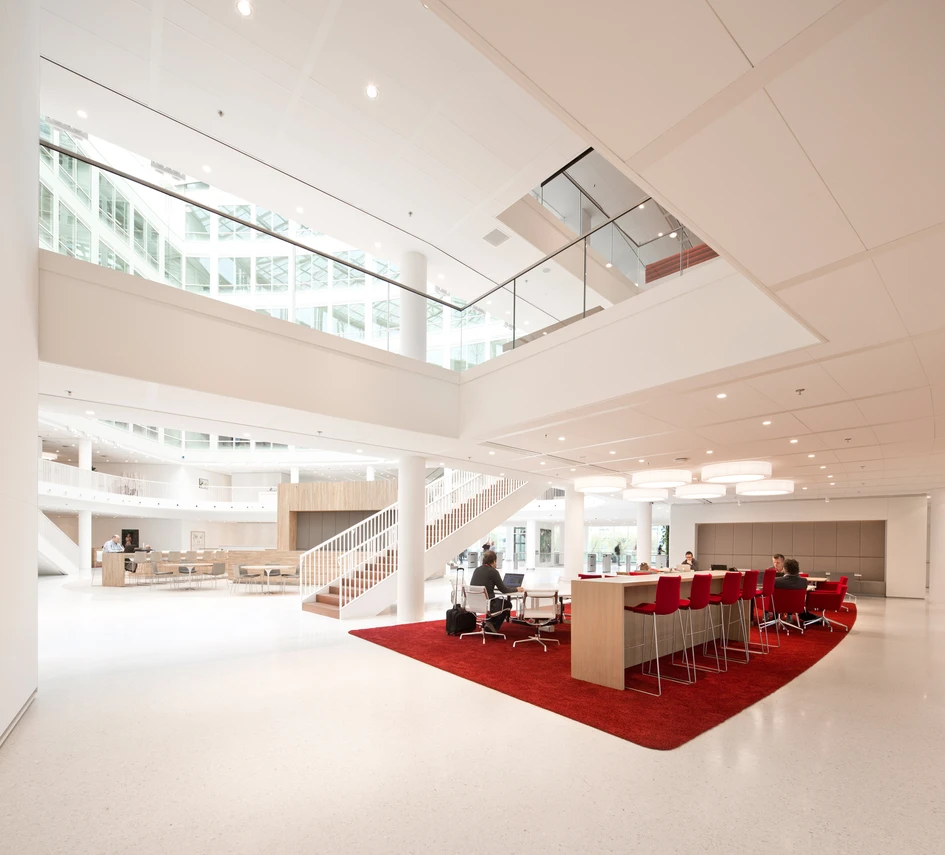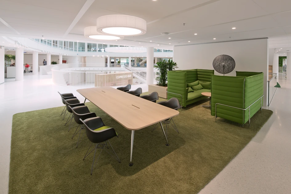 There is a large diversity in working environments, from standard working desks to cubicles, concentration rooms (where one person can work in silence), work-benches for individual work, and teamtables, meeting rooms and informal meeting areas for collective productivity. The floors are designed so there is a balance between the open and the closed, the private and the public and the quiet and the dynamic. Each employee can select an atmosphere that suits his or her work activity.