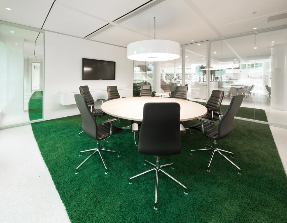 Employees can reach the first floor via any of the three new dramatic, sweeping staircases in the atrium. In fact, the clever interior design of the building and the generous nature of the staircases encourages people to climb them and burn off a calorie or two rather than going for the lazier option of the elevator. The openness of the first floor keeps employees in touch with the airy central atrium and the buzzing espresso bar down below. The meeting centre on this floor is designed with a variety of green tones that grace the lounges, informal meeting areas, transparent meeting rooms and working areas. Staircases extensions reach a
