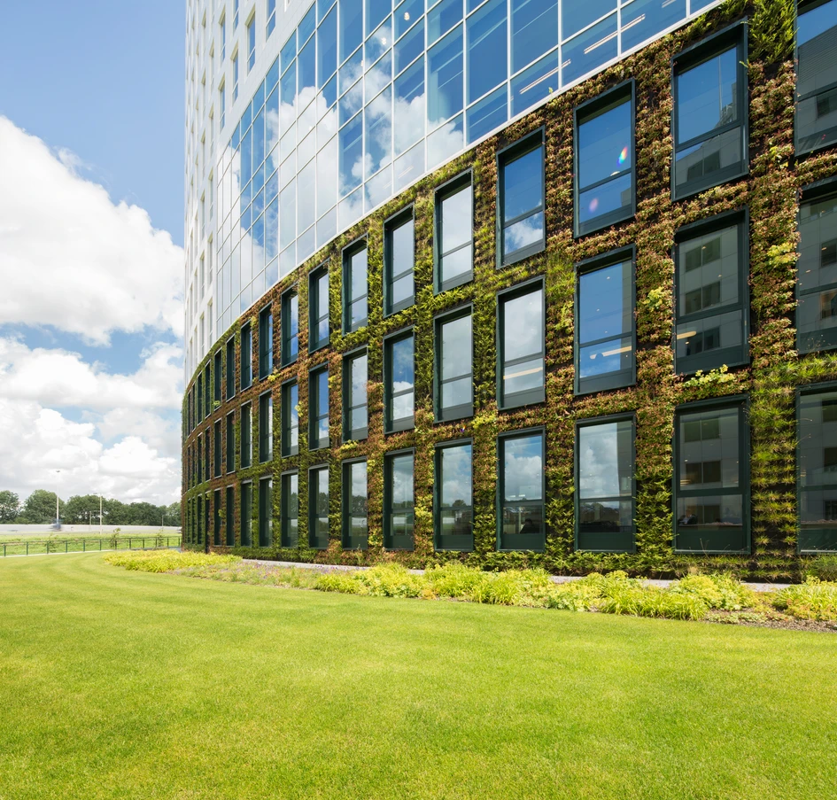 The heart of the building is a central atrium surrounded by a light-filled meeting centre with a reception space, meeting rooms, working areas, informal meeting areas, lounges, a restaurant, a service desk and an auditorium. Sun collectors on the south façade and on the roof track the sun throughout the day, absorbing the maximum amount of solar energy.