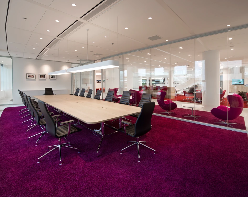 From the entrance, employees and visitors have a clear view of the centrally placed espresso bar – this is another island but one designed not so much with colour but with relaxing blonde oak floors and tables, making a warm and inviting destination. From there, they can gaze up through the light-filled atrium and around the ground floor, orienting themselves. Also from here they can take one of the three dramatic and inviting staircases to the first floor. The ground floor meeting island has lush and vibr ant red, purple, beige and orange carpets, equally colourful chairs and, as a calming contrast, subtle oak tables. To boost the design diversity further still, the beige carpets are furnished with white tables and chairs, and the entire experience is enhanced by lighting designed by Studio Rublek which brings out the rich hues and textures of the space.