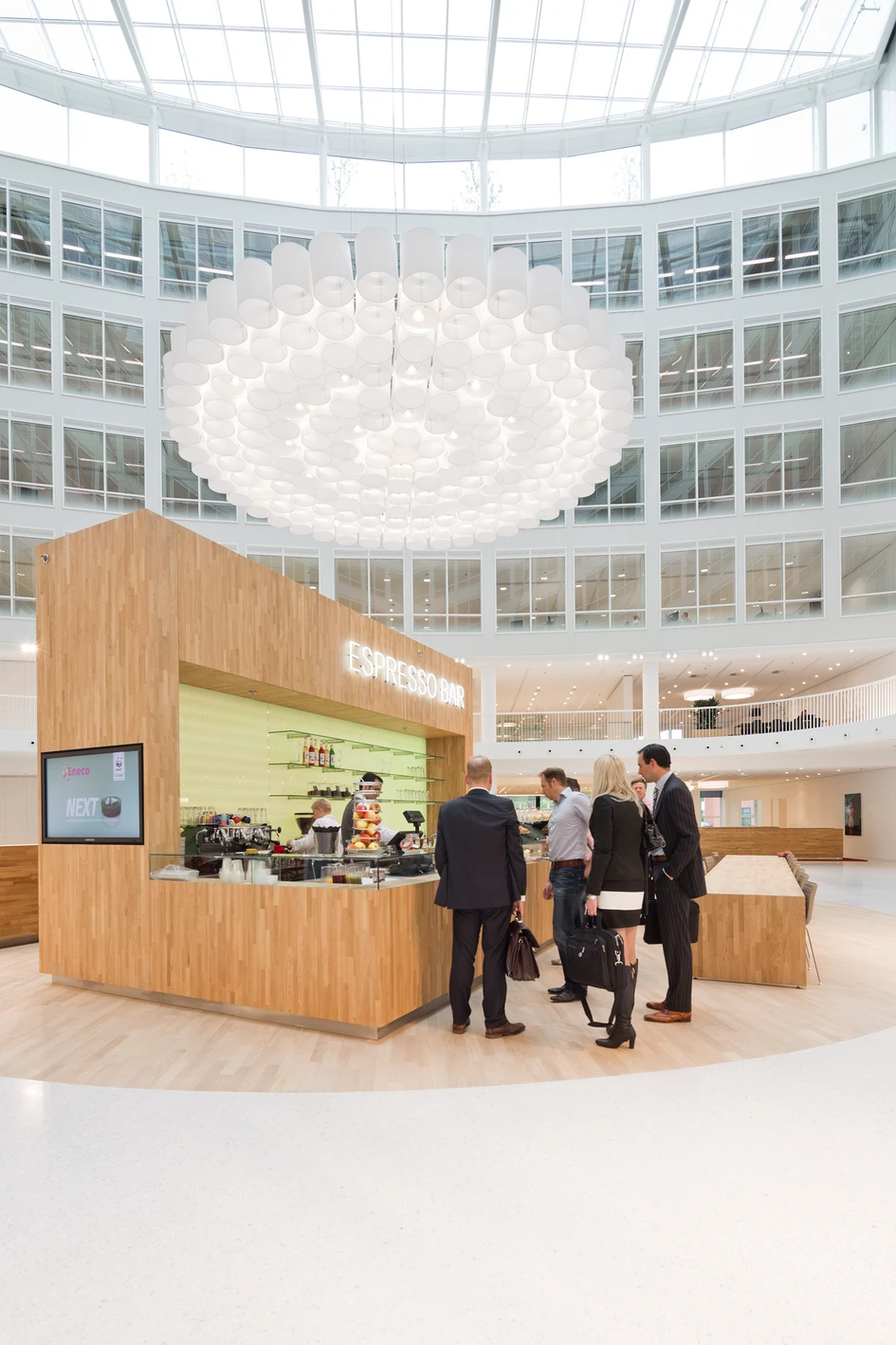 When arriving in the entrance hall, visitors are escorted by receptionists to one of the three Corian reception desks, making them feel they are arriving in a five-star hotel rather than an office building. This innovative piece of interior design reflects a new concept for hospitality that suits Eneco’s genuine generosity and focus on people.