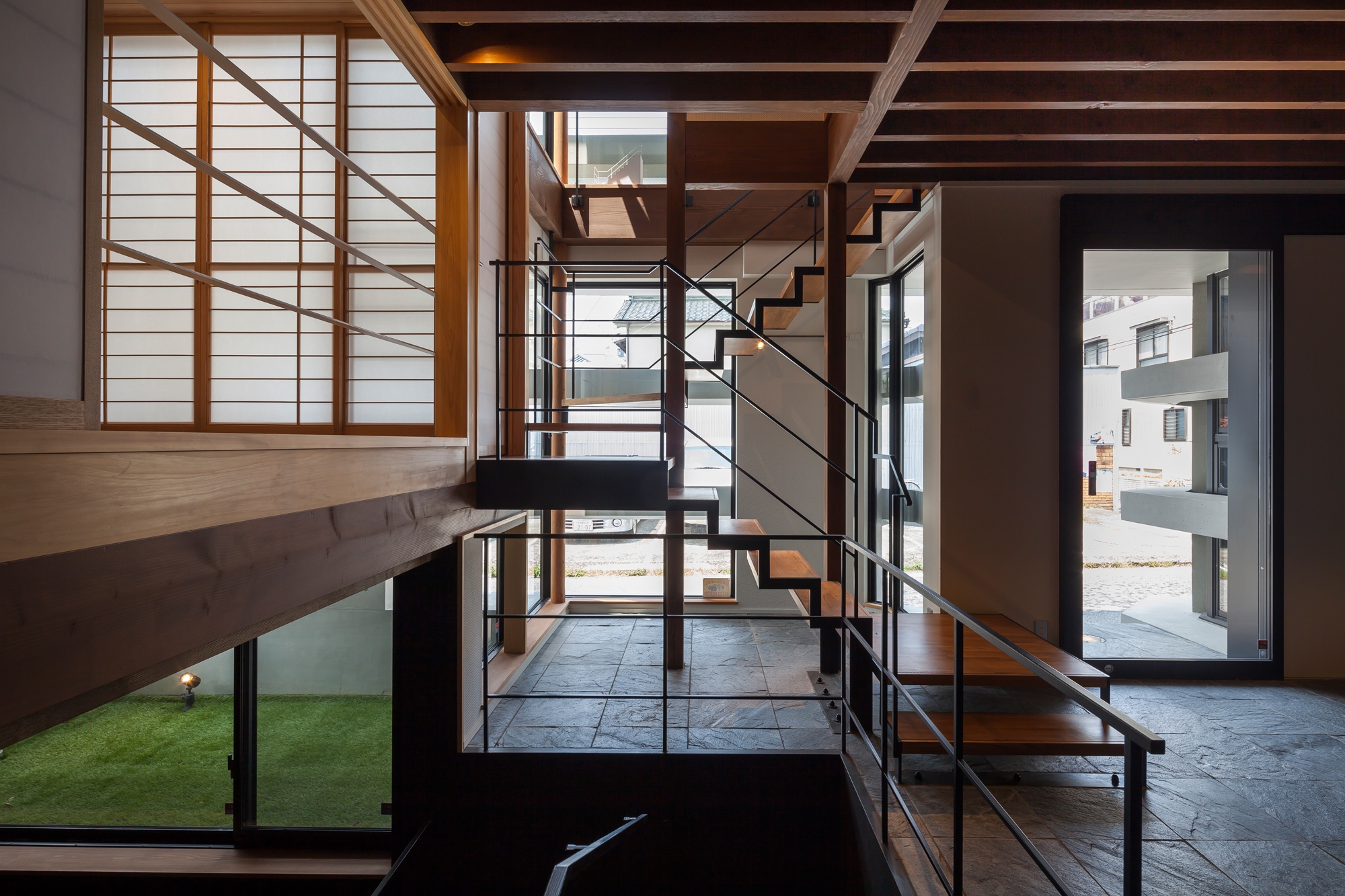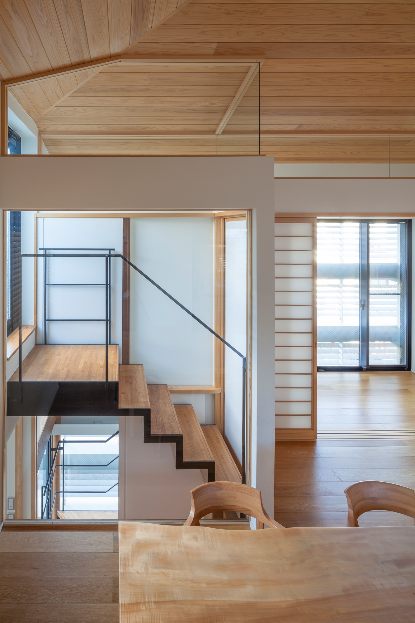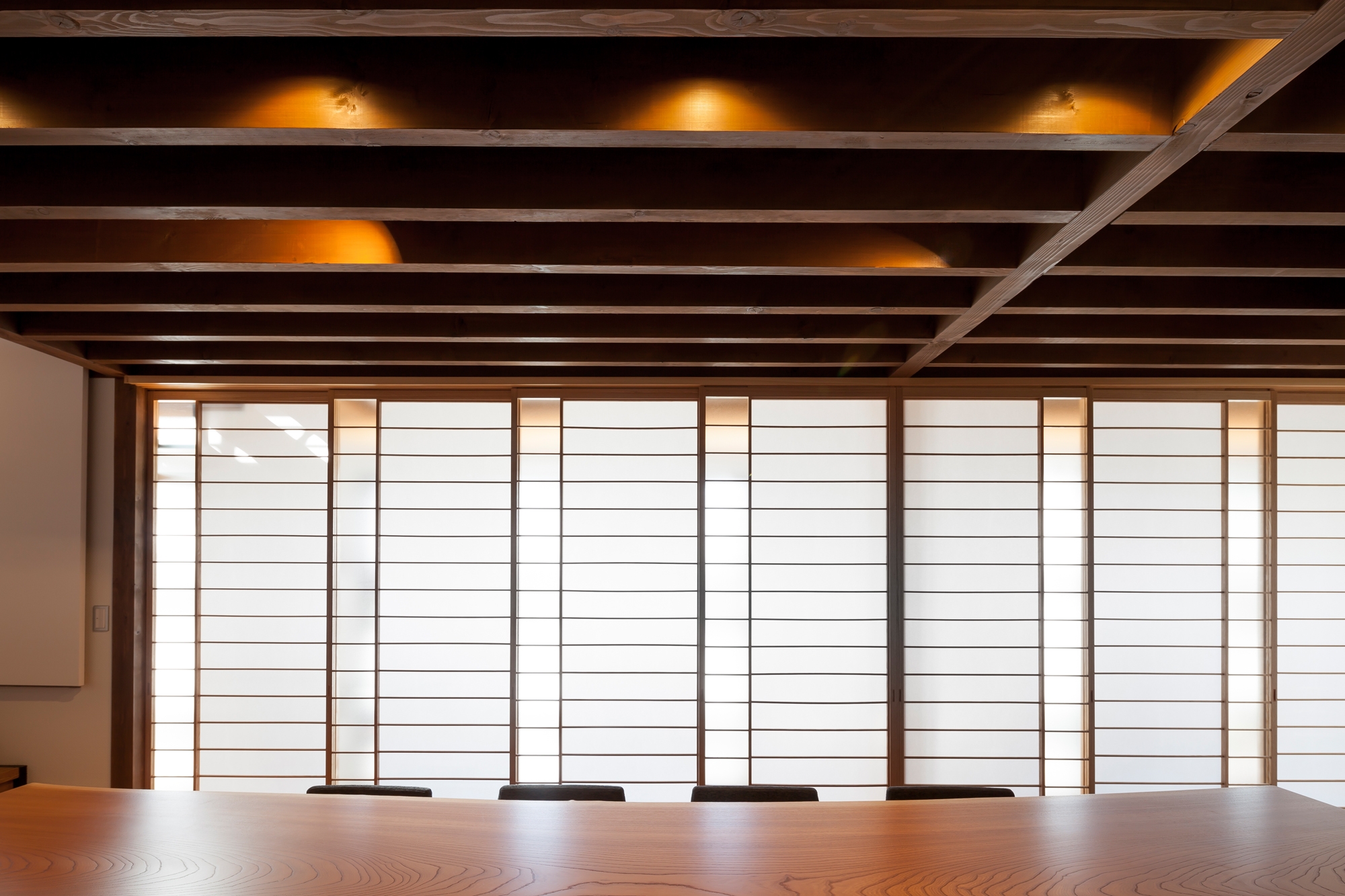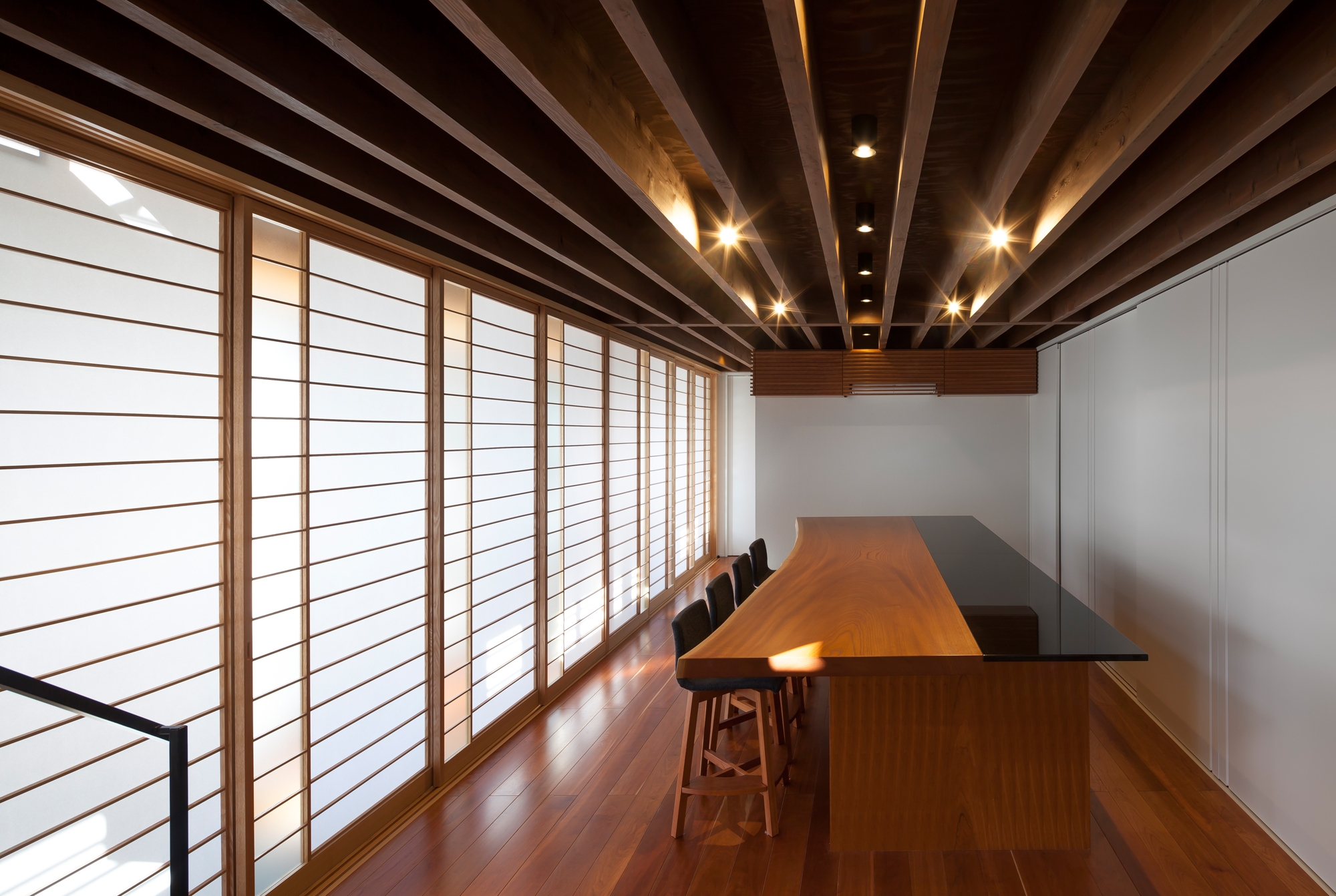 Moreover, in the internal space, Japanese Shoji, right weight walls make various spaces plastically and satisfactory environment. In the west side, the walls make an insulating air layer between large windows and internal spaces. Working an air conditioner, the walls change air volume of the spaces.