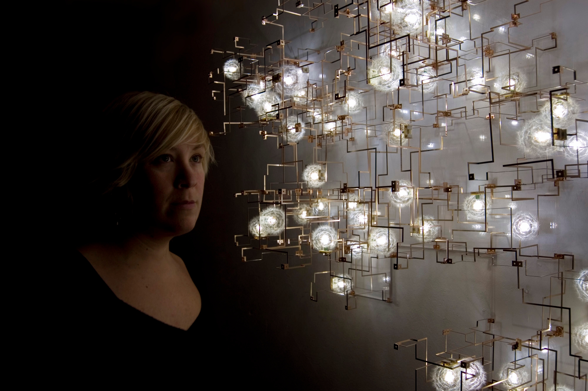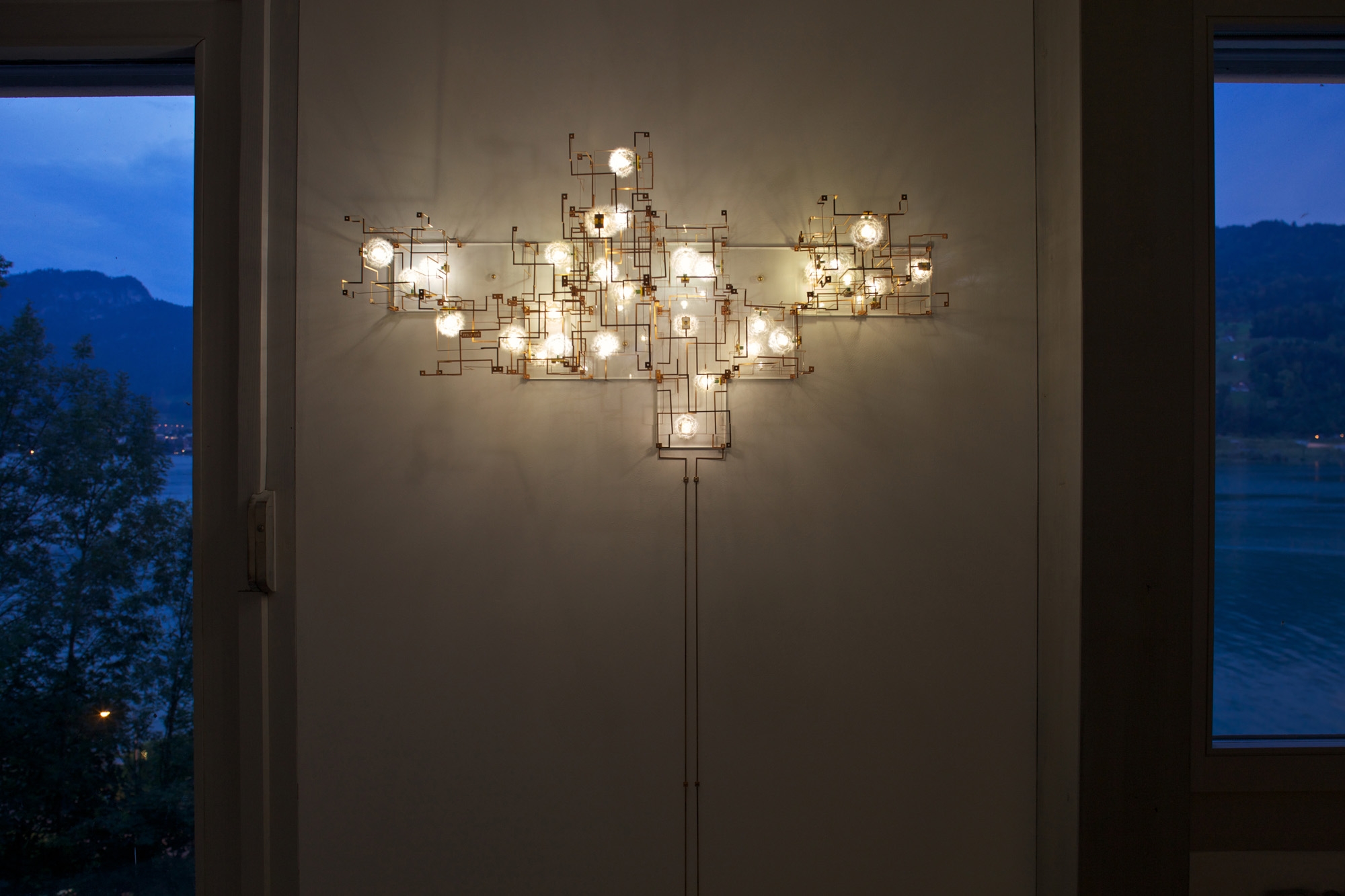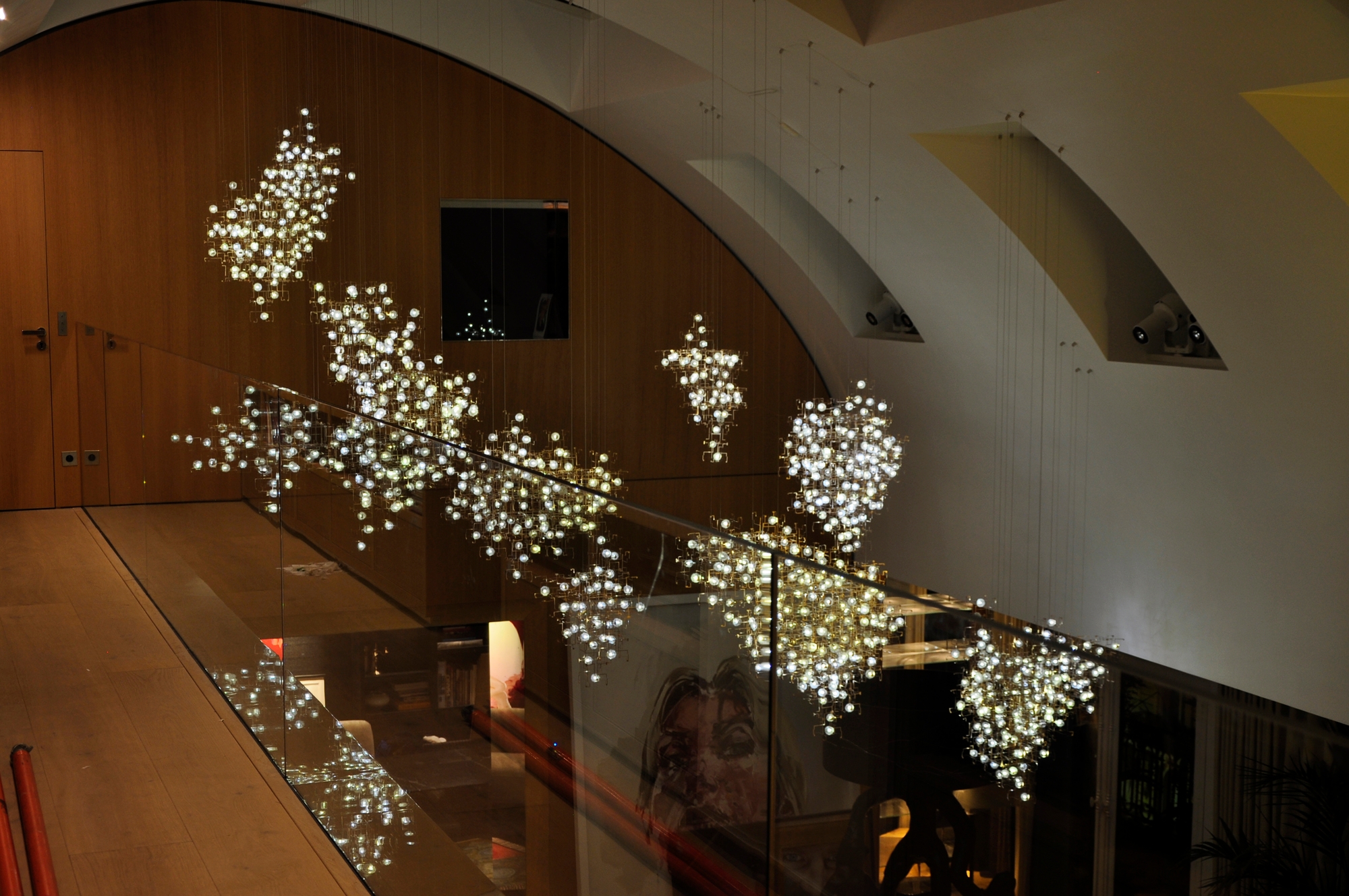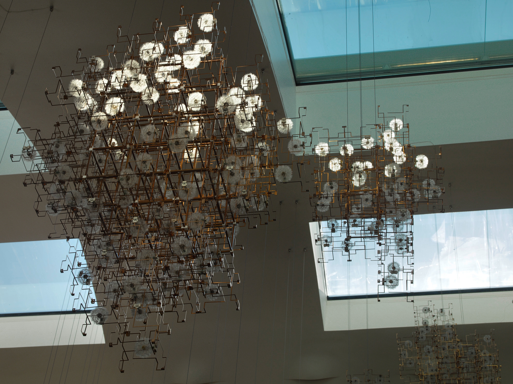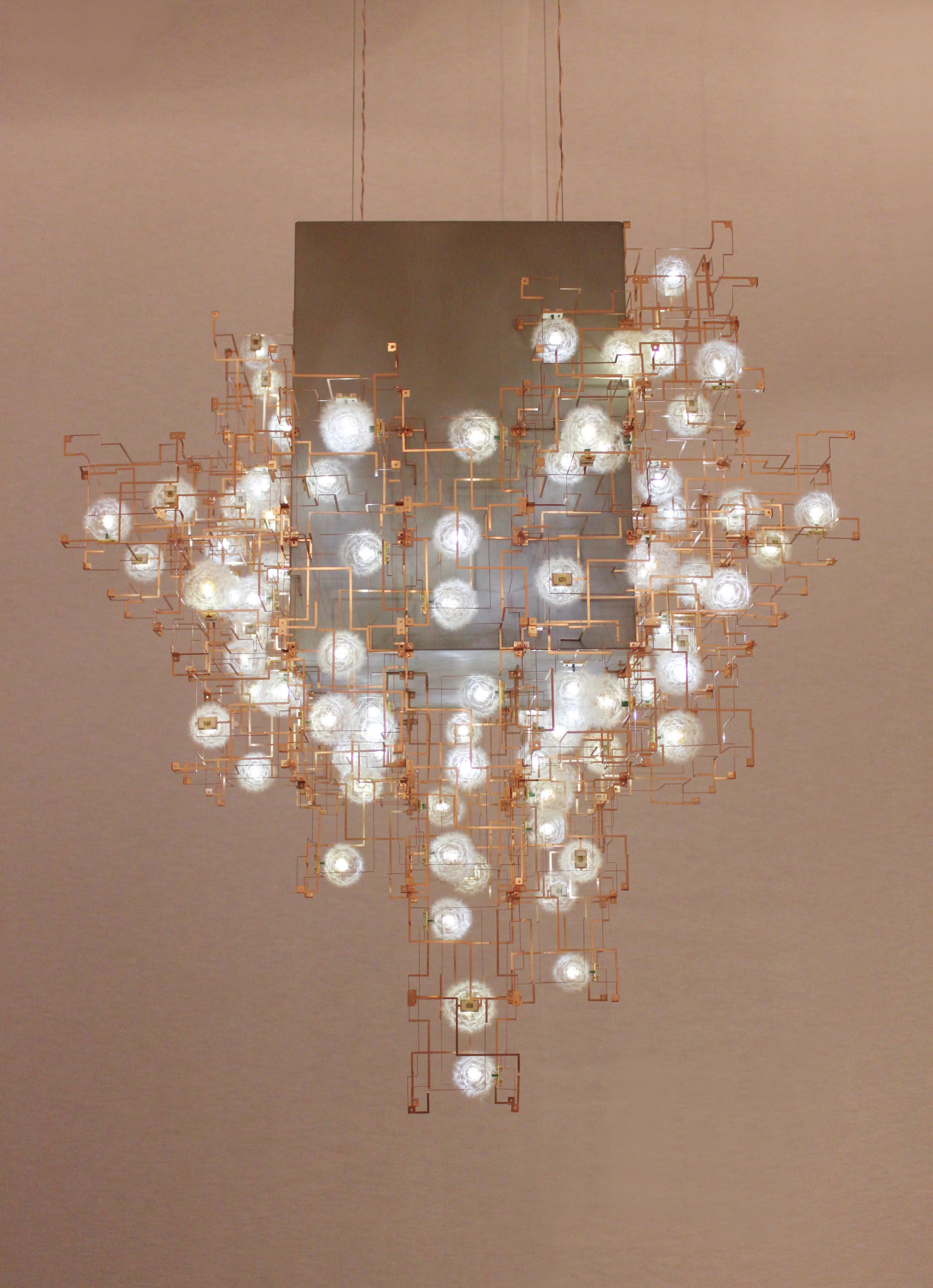 FRAGILE FUTURE III (FF3) is a modular system combining nature and technology in a tender balance. The 3-Dimensional bronze electronical circuits contain luminous dandelion seed heads and bolt together to form a power circuit overgrowing walls, floors and ceilings, forming sculptures and chandeliers.