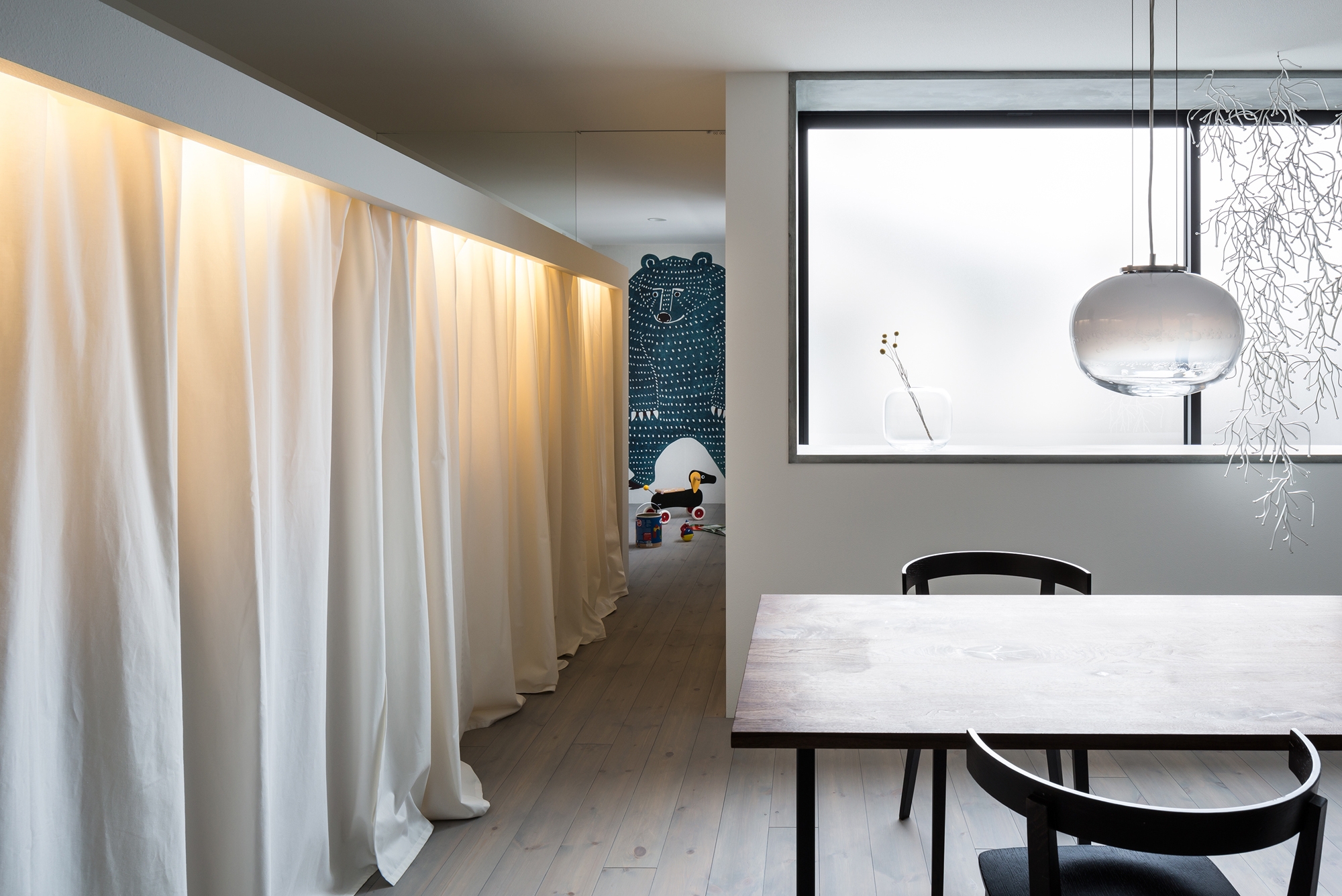 While the spaces are separated and independent from each other, the framed openings created on the wall allow continuous sightline between these spaces. These openings have been designed so that the residents feel the atmosphere from each other.