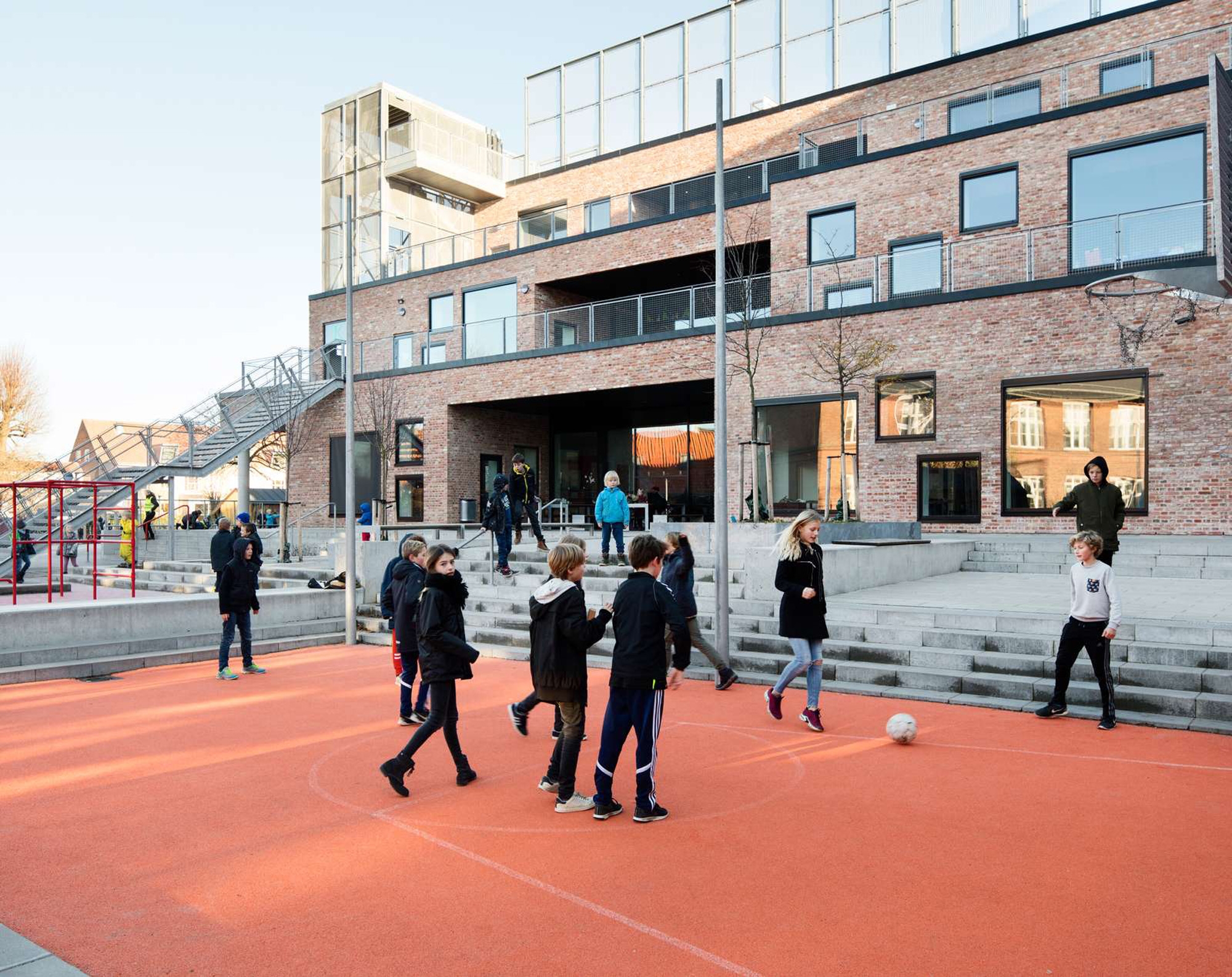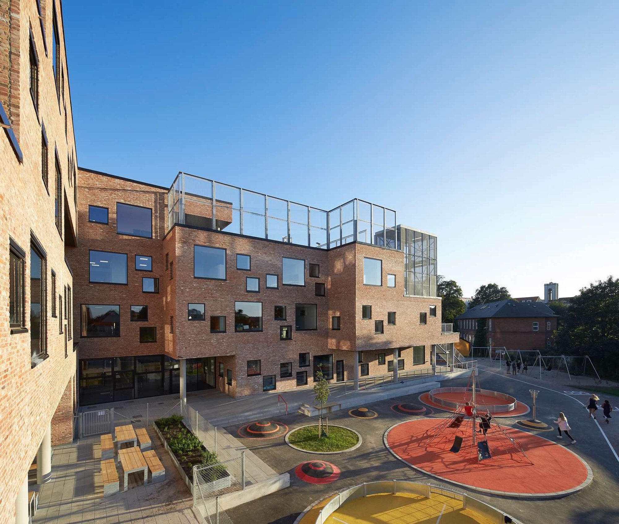 Frederiksbjerg School is the first new-built school located in the center of Aarhus, the second largest city in Denmark, in approximately 100 years. The new school, which also houses a daycare facility and a youth club, is built on the site of former school, Sct. Annagades School. For decades Sct. Annagades School was a well-established gathering place for the local community. This lead to a vision of the new school building supporting the old memoir. The school is dedicated to the youth and children of the local area. It aims to give children as well as adults an ideal environment for unfolding and learning. In the design of the building an architectural focus lies in numerous spatial qualities such as daylight and materials creating an environment which invites learning through movement and sense-perception. The building follows Aarhus City Council’s program for new learning environments in schools and public institutions. The program focuses on a merge between the building’s organization and educational practice and purpose, which research proves has immense impact on children’s learning.