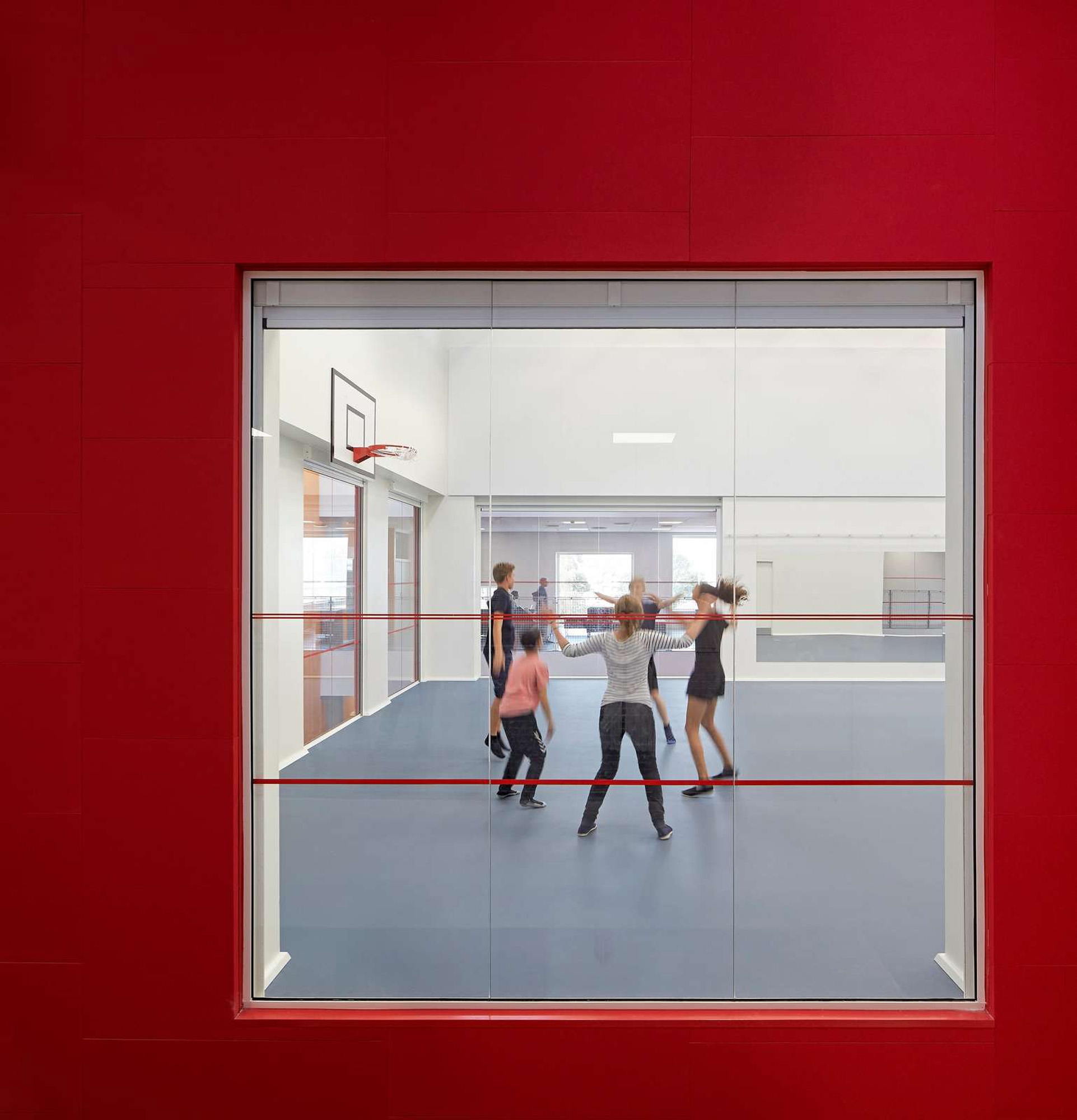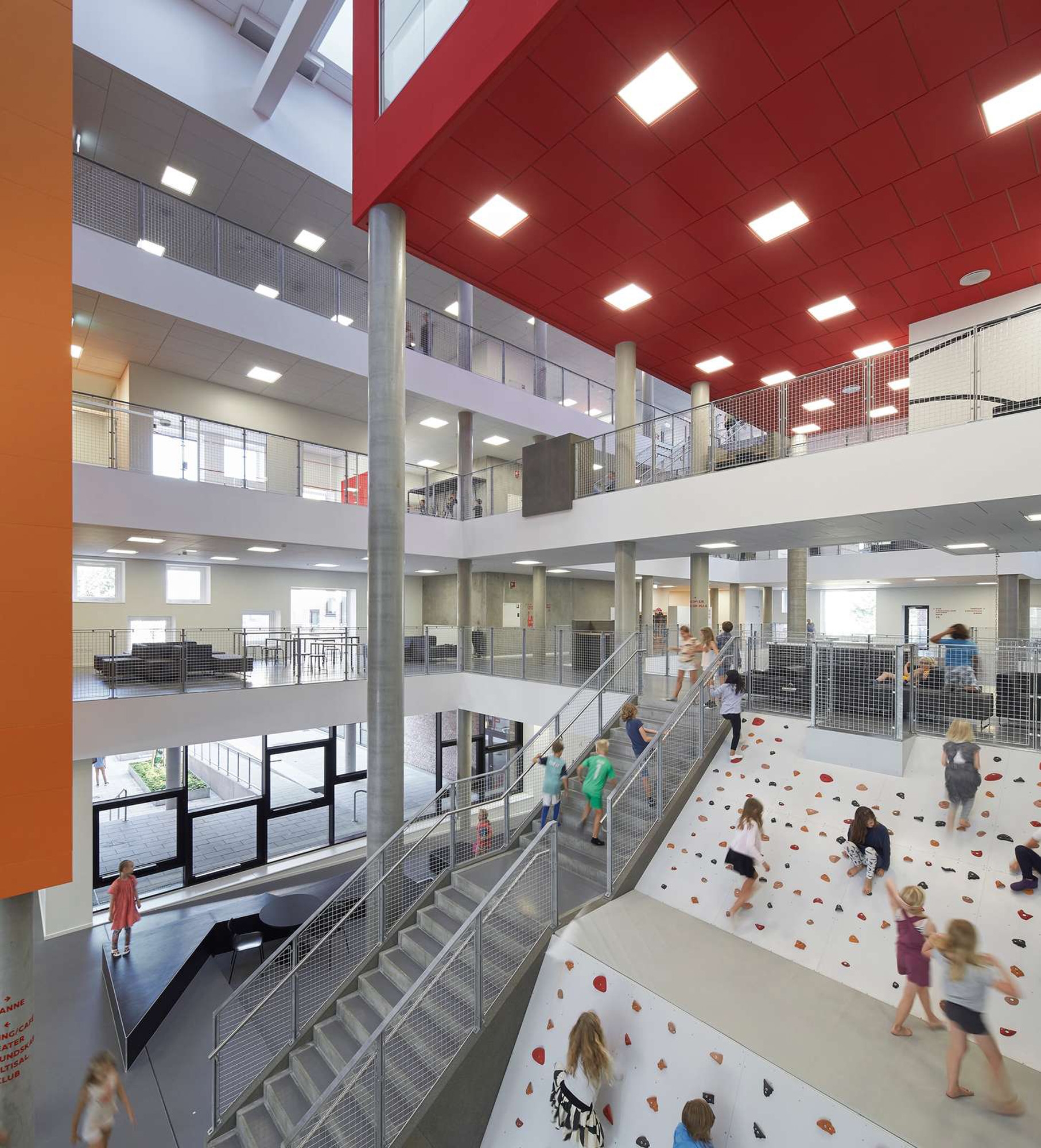 Inside the building the colors and materials support the orientation and logistics of the school. Two halls which almost float in the atrium are covered with red and orange acoustic tiles and three big wall paintings wrap themselves around the detached group rooms.