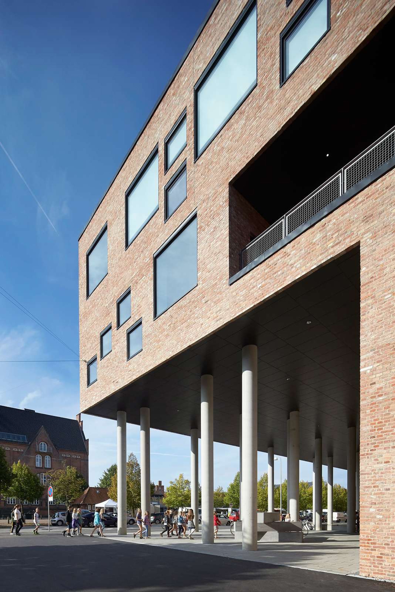 The school is placed in the Frederiksbjerg district in the southern part of the central Aarhus. The district is mostly characterized by 4-6 story building blocks in red bricks. In the area around the new school there are many public institutions and activities, e.g. a swimming stadium, a street marked and a large playground. The main entrance is placed on the corner of two historic streets and an cantilever is built in double height with concrete pillars which match the pillars in the atrium. Built along the boulevard is a big, south-facing staircase, often used as benches, which merges the school with the surrounding context.