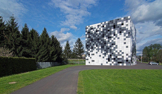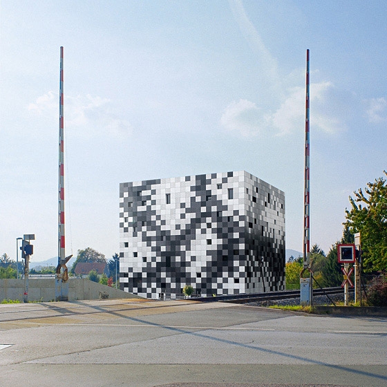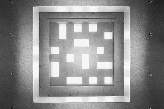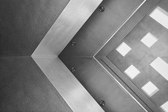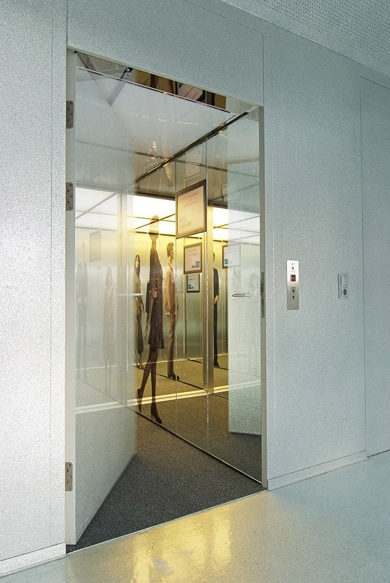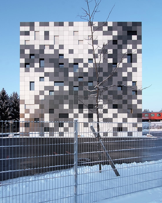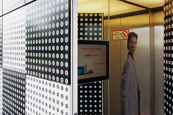 Darf die BesucherIn nach Voranmeldung und nach Sicherheitskontrolle auf das Areal, pixeln die Grauwerte langsam wie Druckrasterpunkte auf, welche sich wiederum bei weiterer Annäherung an das Gebäude schließlich als Motive eines Ornaments darstellen. Wie von Zauberhand öffnet sich darauf langsam ein Stück Fassade – dahinter befindet sich ein verspiegelter Raum, der als Lift automatisch in das im 1. OG liegende Foyer fährt. Der Empfang ist als dreigeschoßiges, geschlossenes Atrium ausgebildet und ist von oben mit wenigen Einzelglasflächen natürlich belichtet.