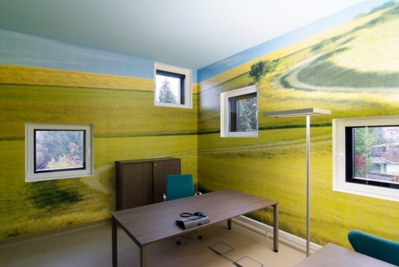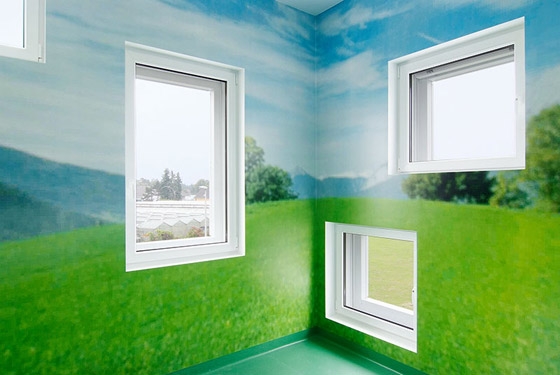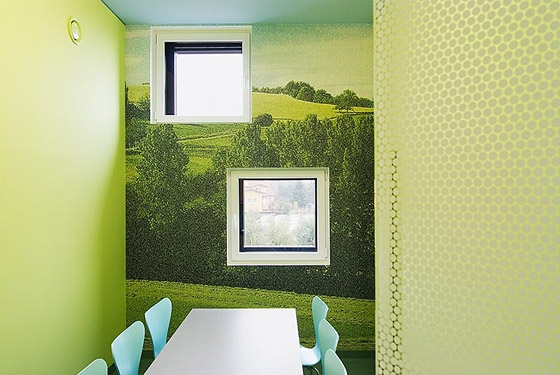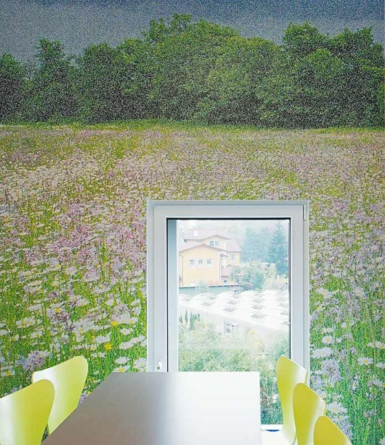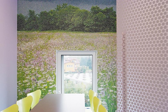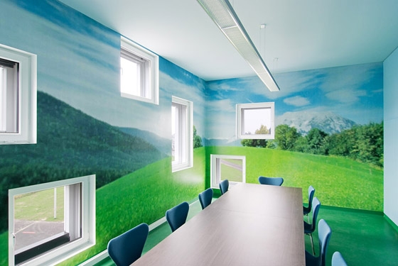 Die einzelnen vom Atrium aus erschlossenen Funktionsräume, wie auch alle Einzel- und Kleinstgruppenbüros, sind in Bezug auf ihre Nutz- und Belichtungsflächen aufs äußerste minimiert. Die gesetzlich geforderte Belichtungsfläche wurde in allen Räumen in mehrere Einzelfenster aufgeteilt, um möglichst viele und unterschiedliche Blickrichtungen, sowohl beim Sitzen als auch beim Stehen, zu gewährleisten. Die reale Umgebung des Gebäudes erscheint dabei wie in unterschiedlichen Filmausschnitten, die gleichzeitig auf einem Computerbildschirm in mehreren Frames präsent sind, als Ausblicke in eine beinahe virtuelle Welt. Verstärkt wird diese Wirkung noch durch die, den jeweiligen Räumen zugeordneten, unterschiedlichen Landschaftsmotiven aus der Oststeiermark - großflächige Bildinstallationen, die auf allen Außenwänden als Kunstwerke archaische Ausblicke in die Heimatlandschaft des Firmengründers bieten. Virtuelle Panoramen mutieren zu realen Ausblicken um selbst fragmentiert zu werden durch Ausblicke, die sich in virtuelle Bildausschnitte transformieren.