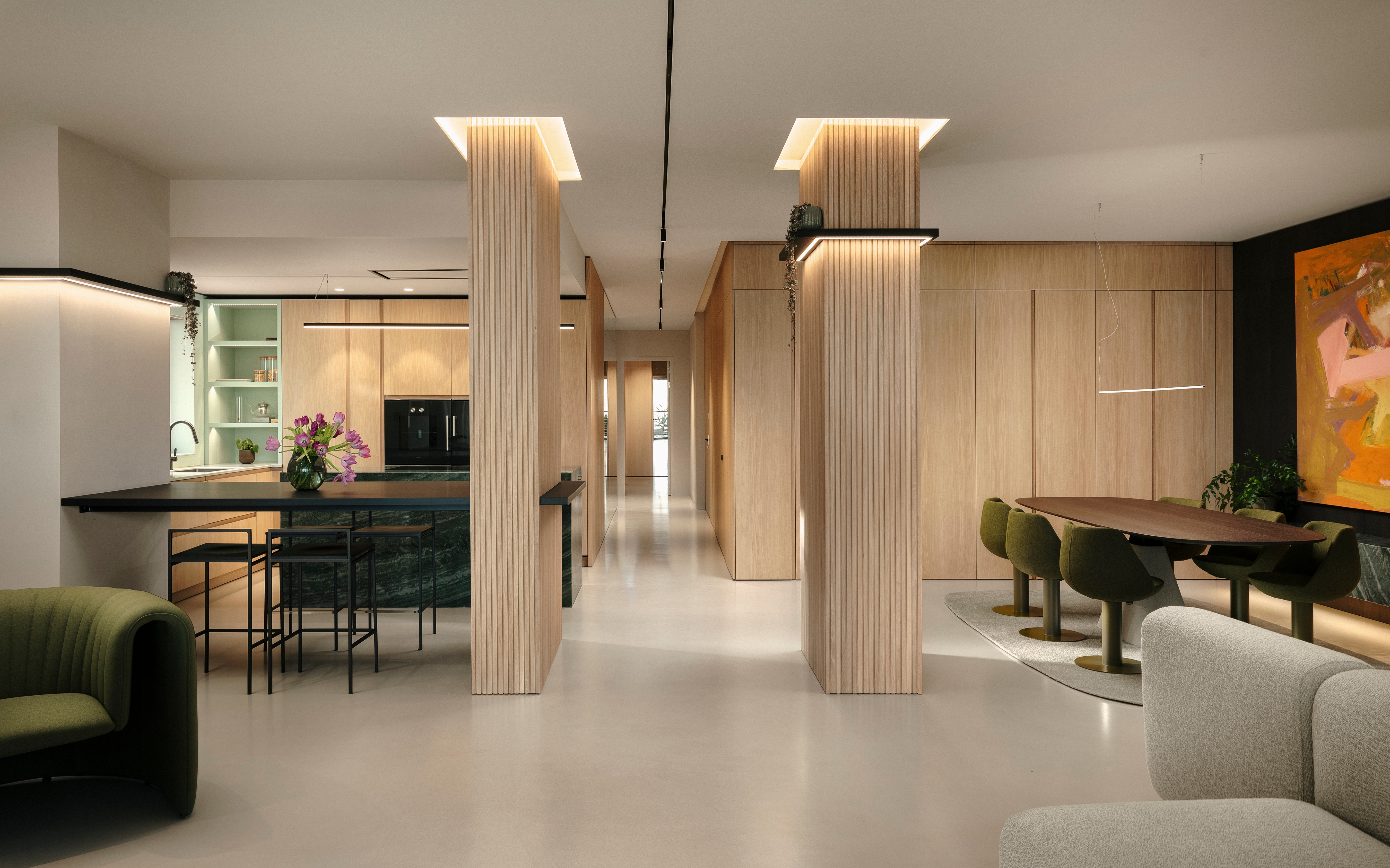 Characterised by a minimalist yet impactful spatial composition, the architectural language is defined by a seamless envelope of light oak joinery, fostering visual continuity between bespoke storage solutions and kitchen elements. Subtle detailing, such as V-grooves and concealed handles, refines proportions while maintaining a clean, uncluttered aesthetic. Fluted finishes on structural columns introduce a dynamic interplay of texture, reinforcing verticality and lending the space an air of sophistication. A linear recessed lighting feature extends throughout the home, subtly guiding the eye towards the panoramic views and making the external landscape an integral part of the interior experience. The flooring, finished in warm-toned microcement in a refined cappuccino hue with a slight sheen, harmoniously bounces light throughout the space, creating a seamless foundation for the overall aesthetic.