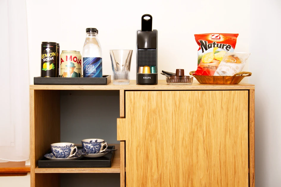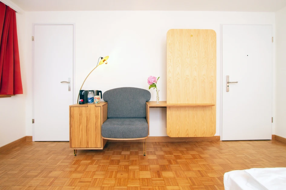 Le designer s'est penché sur l'année de construction de la villa et sur les tendances du design de l'époque, afin de trouver l'inspiration pour l'identité conceptuelle de la Villa Maria et de transposer des éléments choisis des années 50 dans un concept contemporain. „Audacieux, frais et moderne“, Daniel Hunziker explique son choix, „la maison devait présenter un design résolument affirmé“.La „collection VM“ comprend des modules polyvalents qui combinent vestiaire et minibar, soit avec des assises, soit avec une table. La collection se compose également d'armoires et de lits avec éclairage intégré. La gamme de meubles a été réalisée, sur la base de panneaux multiplex contreplaqués, dans les ateliers de Girsberger, faisant appel à la menuiserie, à la sellerie et à la construction métallique.