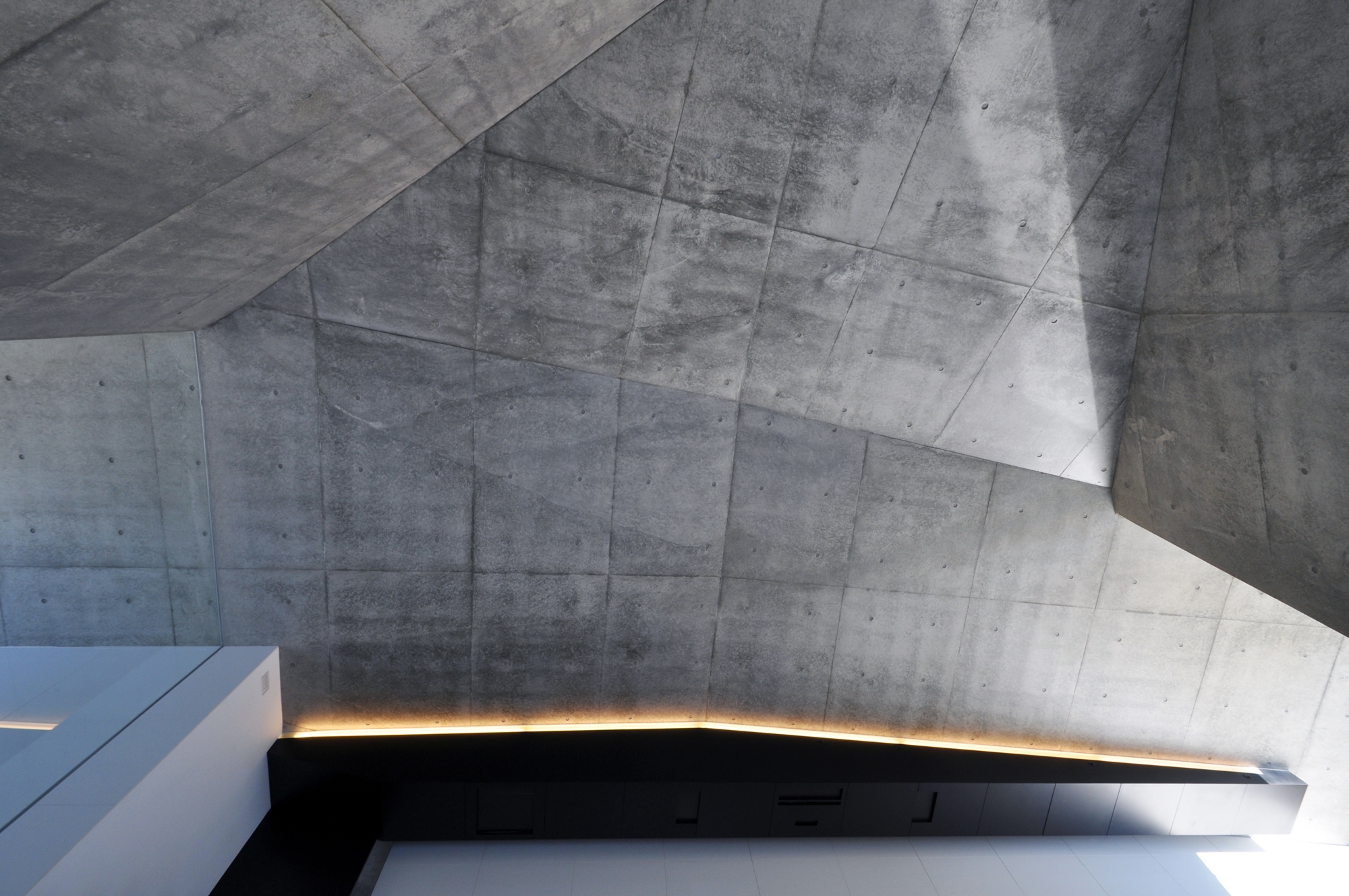 The location is at the bottom of two plateaus on a soft foundation. Therefore, stakes were necessary to support a reinforced concrete structure. In order to reduce costs, contacting area to the ground was minimized and the number of stakes was reduced. Accordingly, the upper structure was cantilevered. Then, the walls in varying volumes and the roof slab were made into three-dimensional continuous slanted surface and the stress transmission was rationalized, which became a characteristic form.