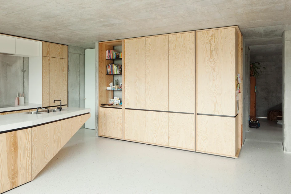 This freestanding family house to the north of Brussels, is situated on a plot which due to its irregular shape remained unsold for a long period of time. The base shape of this house is an offset of this particular form. The outer and inner walls are constructed in the same material, in situ concrete, leading to a monolithic volume. The interior organization of the house tries to follow a similar consistency.