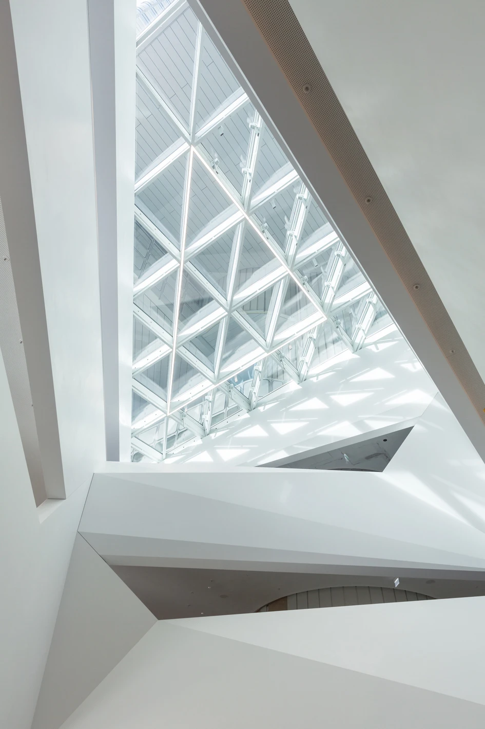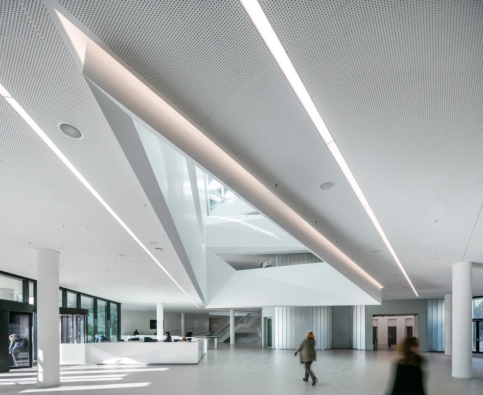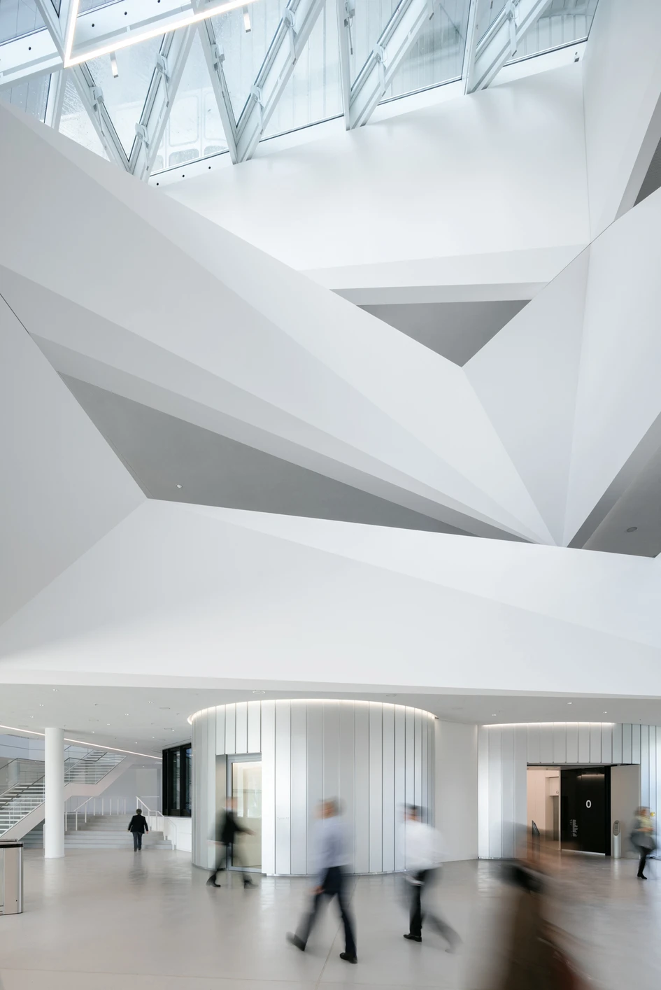 The 114m high HVB Tower in Munich designated and listed as a protected monument was converted by the architecture firm HENN into a climate-efficient “green” building. In the foyer, a huge "crystal" made of solid surface material unfolds over 3 levels upward in the building. The crystal acts simultaneously as a balustrade and as a spatial boundary to the airspace in the centre of the building. What appears to be an object in a single piece of material is in reality approximately 850 square meters of solid surface material consisting of 500 individual parts that have been assembled, bonded together and then sanded gently to the millimetre. Rosskopf + Partner was commissioned to manufacture and assemble this architectural object.