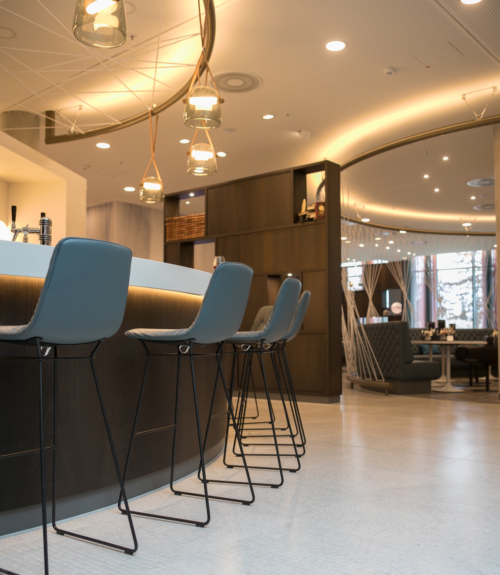 Dans le hall à plan ouvert, les motifs de la collection Fossil - présents dans tout le rez-de-chaussée dans la teinte Grey - se déplacent dans différentes directions et mènent agréablement à travers les chemins où le restaurant, le bar et le hall se rencontrent, créant des illusions optiques de vide et d'autres zones plus denses. Les traits, dessinés à la main, revisitent les empreintes préhistoriques des plantes et des animaux sur les formations rocheuses, s'interrompant et se chevauchant comme les signes du temps et les histoires vécues. Une surface particulière choisie en fonction de l'humeur naturelle des intérieurs, pour les animer et les rendre uniques grâce à l'effet graphique et à la touche sobrement décorative.