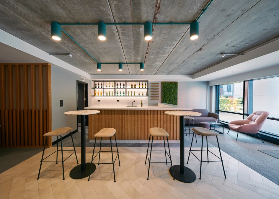 74 worked closely with the client teams to reconfigure the ground and first floor spaces to create the maximum usability, flexibility and contemporary appeal. Changes included an unmanned reception area, now a calm and welcoming double-height lounge space instead, accessed by a new entrance lobby with a sliding door and blue surround. To the left of the new lobby space is a bookable meeting room – ICE Cube – whilst to the right, the lobby leads directly into the new dawn-to-dusk social space and bar.
