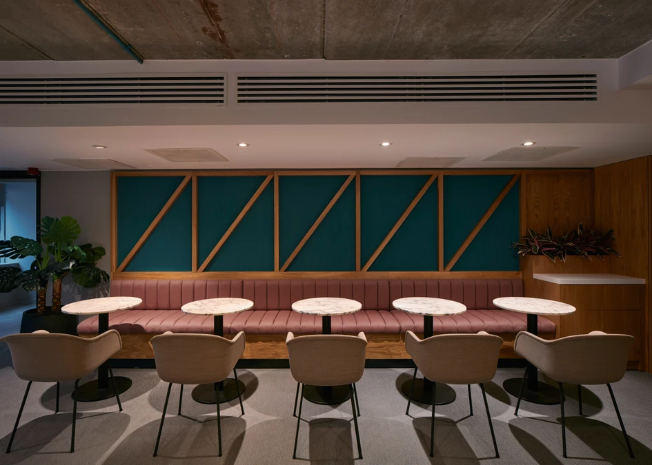 A combination of exposed, raw materials and smart finishes and furniture is used here, including some stand-out light fittings, such as brass table lamps. As well as bespoke banquettes in oak and loose furniture areas, the space includes two 6-seater tables for more formal group working, with Elements by Note pendant lights used once again as an element that ties the spaces together. Planting is once again liberally-integrated into the space. Men’s and women’s toilets are at the rear centre of the space, whilst a disabled-access toilet only is located on the ground floor.