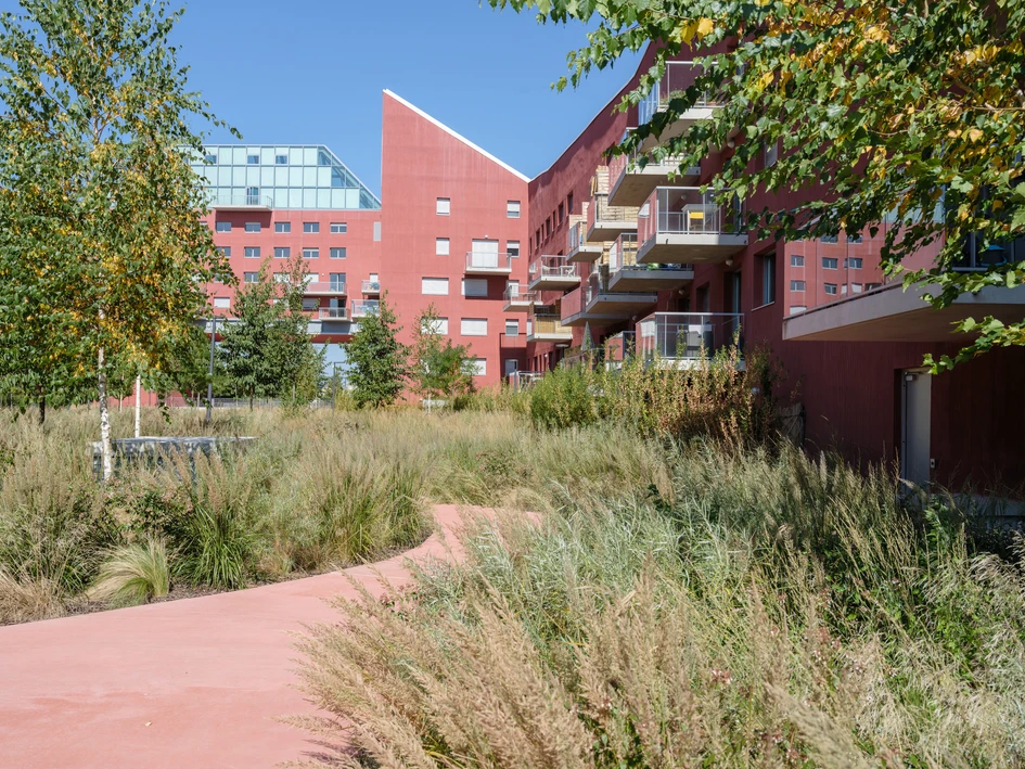 The project’s street-facing façades present a muted, cream-coloured palette, blending in with the surroundings. However, the courtyard-facing façades are finished in a bright red textured stucco. Together with the green courtyard landscape of 83 alder and birch trees and a variety of grasses, this presents a visually exciting environment to complement the liveliness of the park space. At various locations, large portals through the building connect the interior courtyard to the outside, introducing flashes of colour that draw the attention of passers-by and inspire curiosity about the space inside.