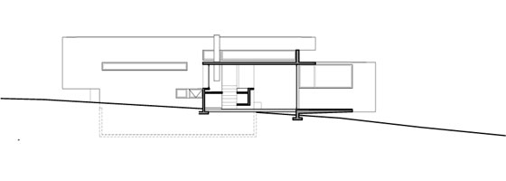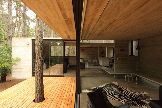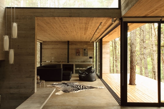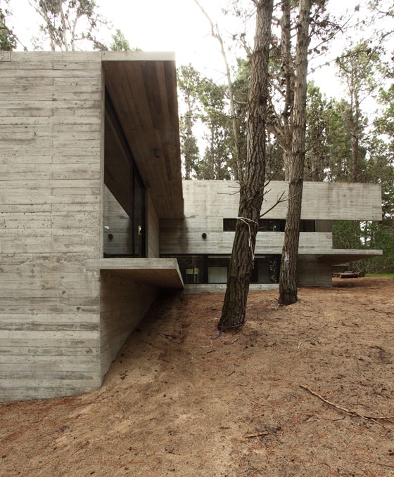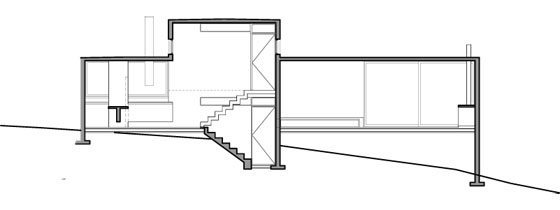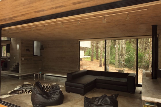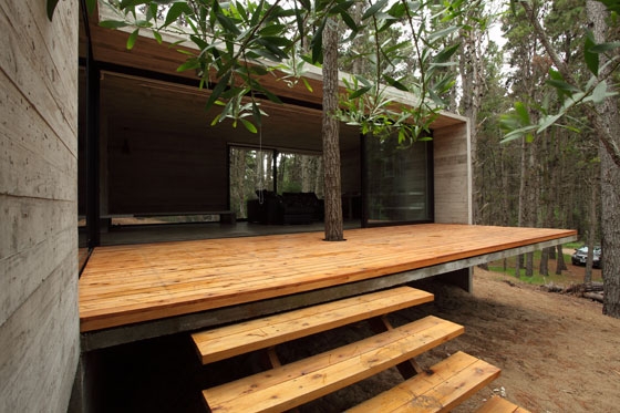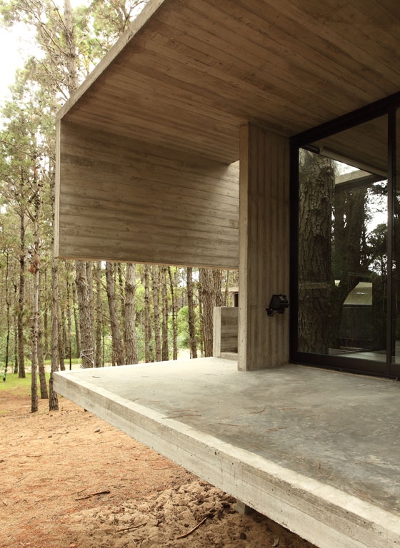 The program was resolved by crossing two prisms perpendicularly and placing it in a forest clearing between the trees. The strong slope of the land was exploited to hide part of the program, reducing in this way the presence of the built volume.