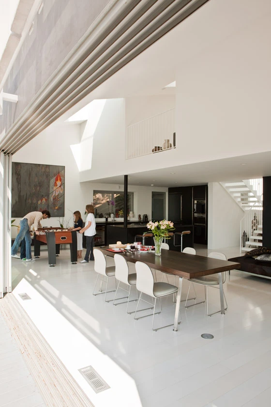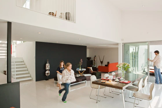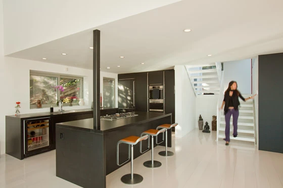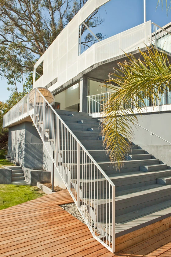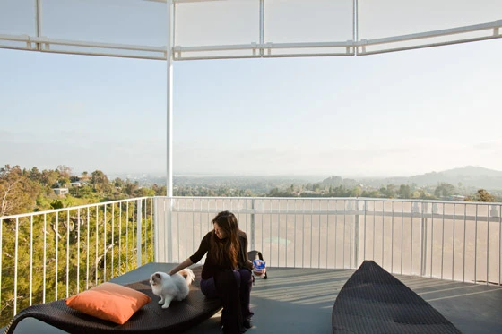 Sitting on an aggressively sloping site in the Crestwood Hills neighborhood of Los Angeles, the Jovanovic Residence combines a progressive and sustainable solution to an existing structure and addition. Through the utilization of a continuous foil wrap, various program elements including; a new guest suite, significant modifications to the master bedroom, exterior decking, and exterior facade, are synthesized together with a singular cohesive element. Usually used to shade vegetation and outdoor space from insects and bugs, this PVC coated polyester woven yarn was re-formulated to sustainably and programmatically cast a new identity and energy on the house. Separated from the existing stucco finish, the durable skin protects the house from solar abuse and heat gain. In addition, rather than following the form directly, the skin reduces the geometries of the existing house to simplified, planar shapes. The resultant forms create a powerful dialogue between existing and new space. At times privacy screening / guardrail / shading device, the skin embraces the house to create new found relationships between indoor and outdoor and public and private.