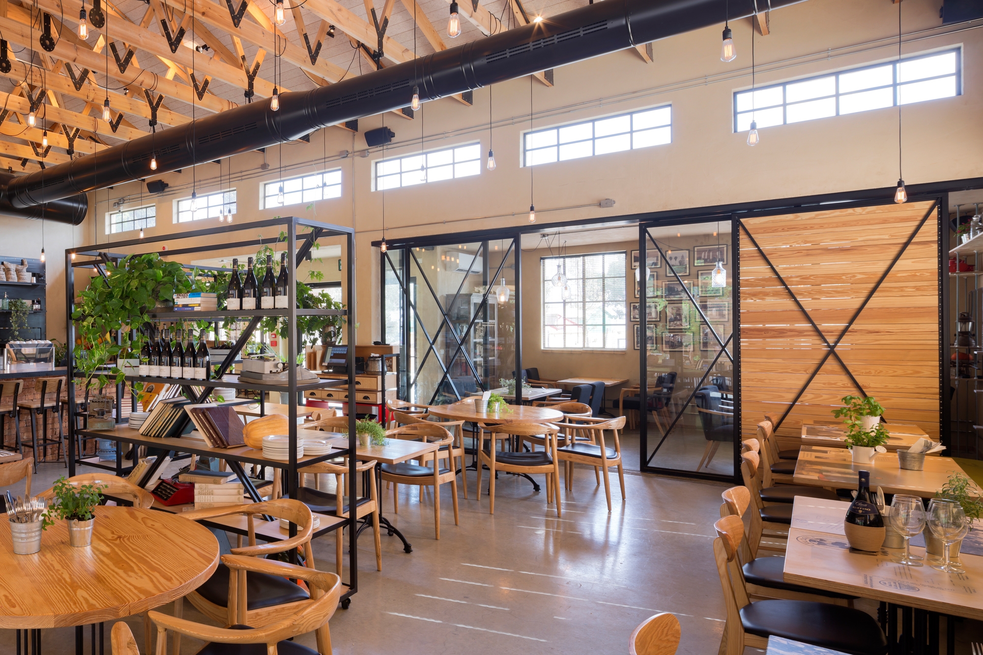 The kitchen was designed with careful planning and efficiency, which includes utility doorways, a separate entrance, and parking for trucks and suppliers. Next to the kitchen, at the north part of the building, located are the office and the restrooms, allowing an easy access from dining area and the yard. A large window facing north towards the courtyard consists of five separate doors, each rotating and connected on a central axis. This unique design allows natural indirect light to pass through. A display of metal laser-cut elements shaped from historic photos displayed over the window.
