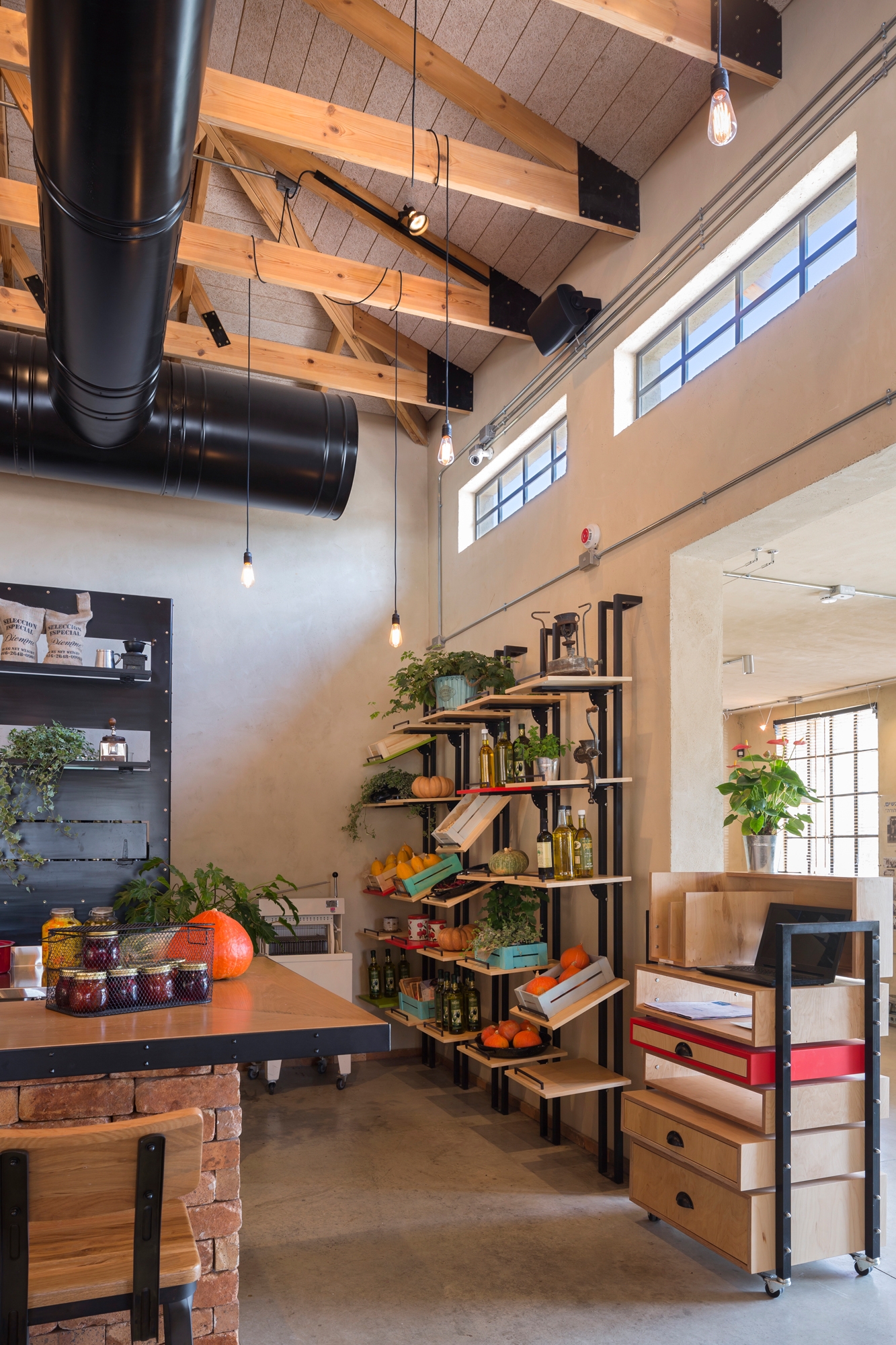The central open space used as the main dining area of the café. Wooden shelves displaying antique items and books used as modular partitions to define and divide the space, creating a dynamic space that can be rearranged according to a specific use of the space. The bricks from the original Tabun oven (a clay stove used for baking bread and pitta) reused for the window thresholds and at the bar structure. Behind the bar is a two-way metal cabinet with open shelves facing the restaurant space, designed to be modular to enables various ways of displaying different items.