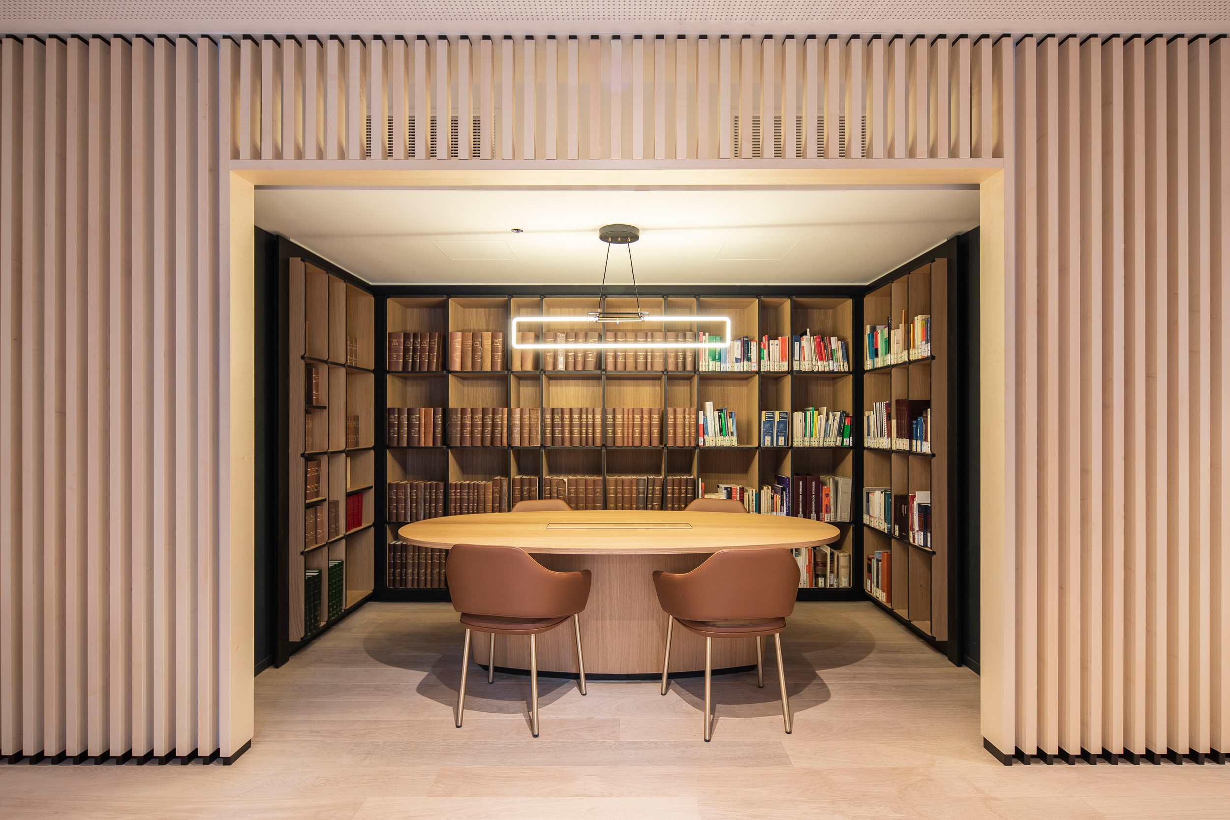 The historic wing, which flanks the street, has seen its classical elegance and former grandeur as eighteenth-century buildings restored. This wing is now dedicated to welcoming the firm’s clients. On the courtyard side, stands a stunning office building, entirely rebuilt, with immense glazed surfaces supported by frames. Between the two, acting as a link between heritage and modernity, there is a monumental pavilion designed as a place to exchange ideas and hold events.