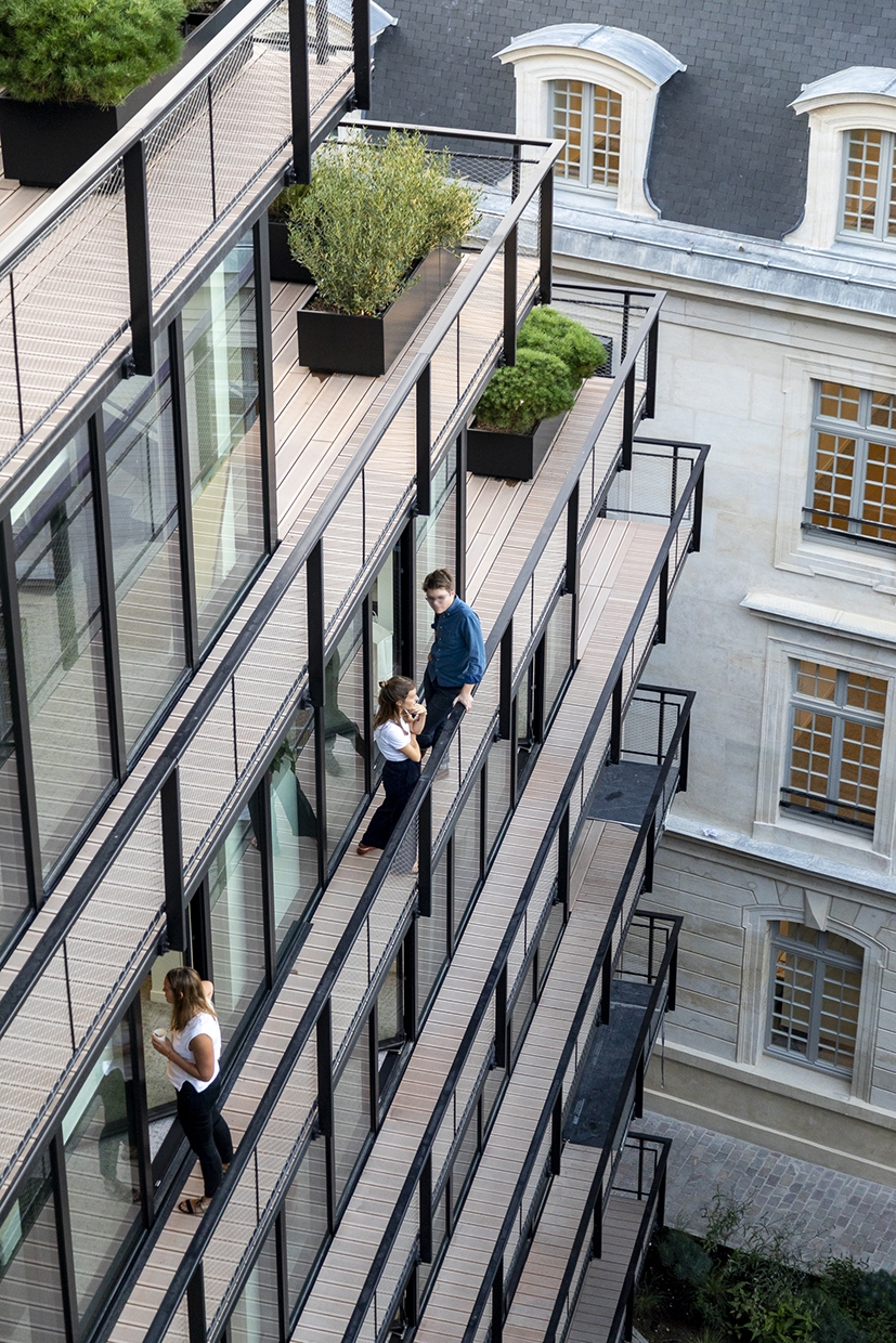 The new Gide headquarters boasts close to 4500m2 of outdoor areas, more than half of which is comprised of green spaces. This includes the garden, the planted terraces, the rooftop bar complete with its own kitchen garden intended for onsite consumption, and the external walkways on each floor. Thanks to modern tools and connectivity, these are mixed-use spaces for inspiration, exchange and even production. These spaces also provide comfort, biodiversity, heat insulation and environmental excellence.